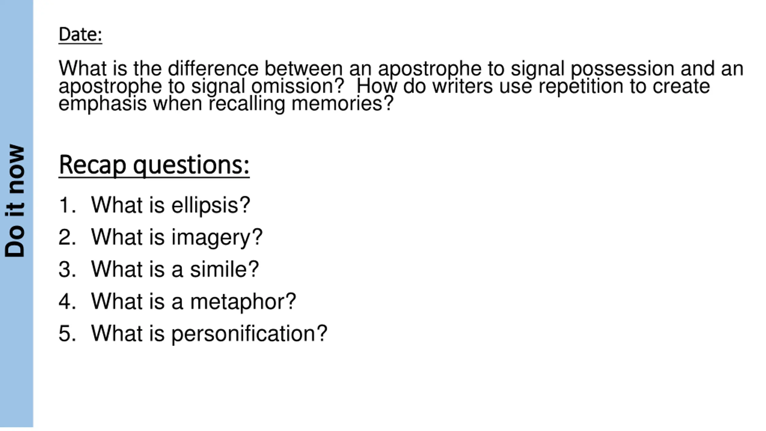 Date: Date: What is the difference between an apostrophe to signal possession and an apostrophe to signal omission? How do writers use repetition to create emphasis when recalling memories? Do it now Recap questions: Recap questions: 1. What is ellipsis? 2. What is imagery? 3. What is a simile? 4. What is a metaphor? 5. What is personification?