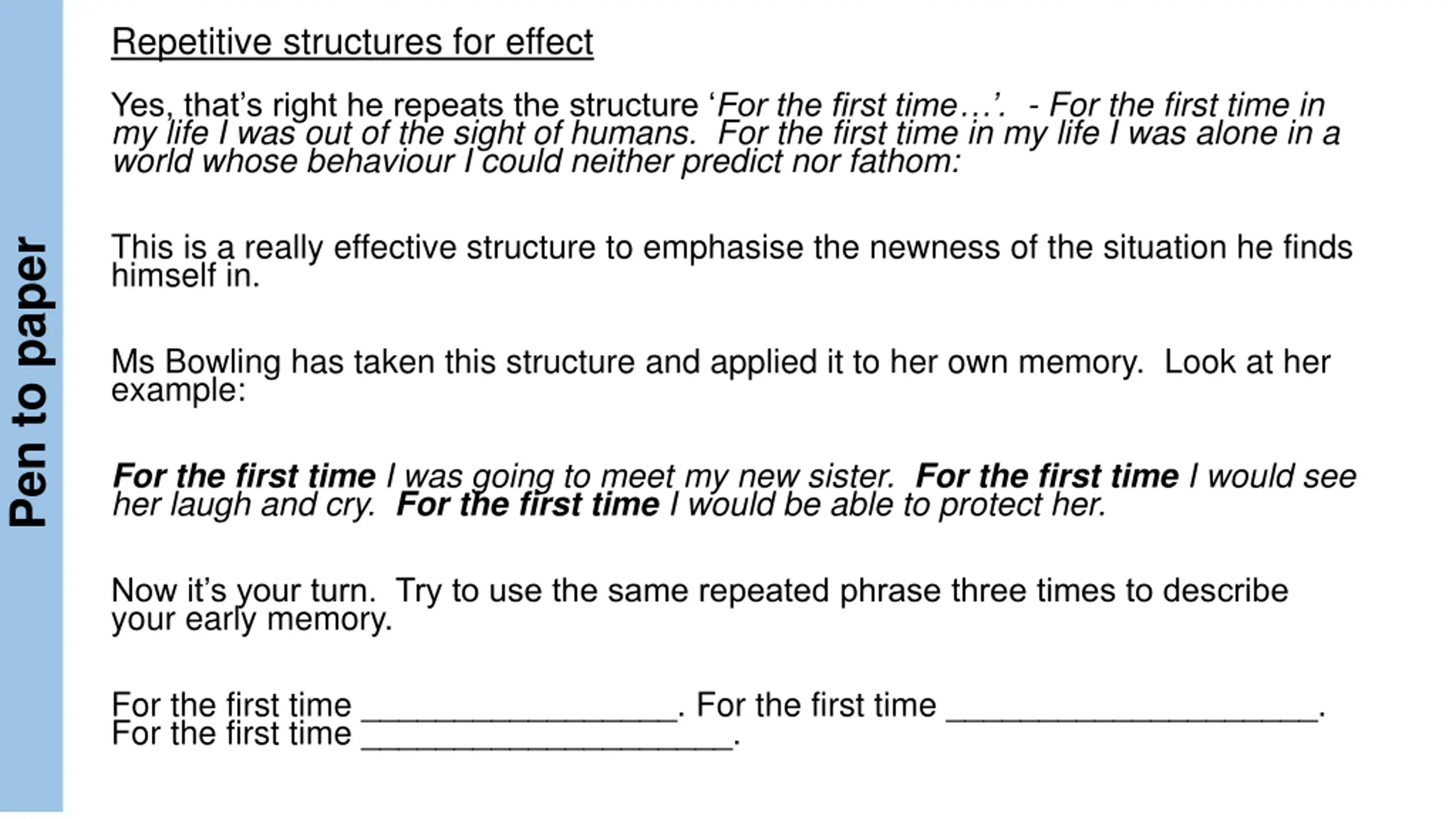 Repetitive structures for effect Yes, that s right he repeats the structure For the first time . - For the first time in my life I was out of the sight of humans. For the first time in my life I was alone in a world whose behaviour I could neither predict nor fathom: This is a really effective structure to emphasise the newness of the situation he finds himself in. Pen to paper Ms Bowling has taken this structure and applied it to her own memory. Look at her example: For the first time I was going to meet my new sister. For the first time I would see her laugh and cry. For the first time I would be able to protect her. Now it s your turn. Try to use the same repeated phrase three times to describe your early memory. For the first time _________________. For the first time ____________________. For the first time ____________________.