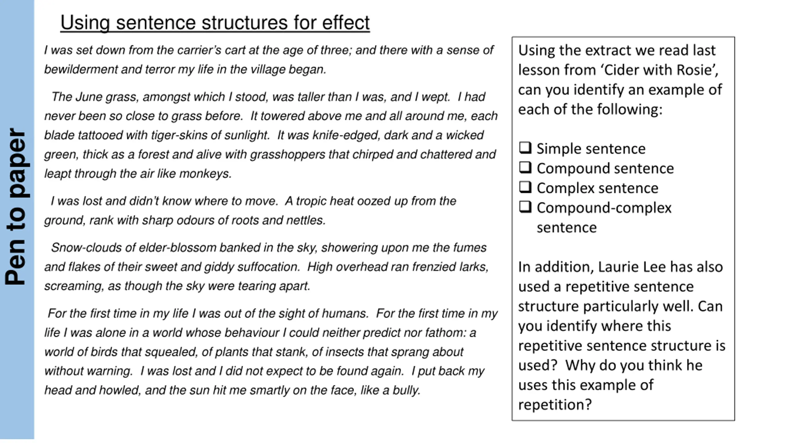 Using sentence structures for effect Using the extract we read last lesson from Cider with Rosie , can you identify an example of each of the following: I was set down from the carrier s cart at the age of three; and there with a sense of bewilderment and terror my life in the village began. The June grass, amongst which I stood, was taller than I was, and I wept. I had never been so close to grass before. It towered above me and all around me, each blade tattooed with tiger-skins of sunlight. It was knife-edged, dark and a wicked green, thick as a forest and alive with grasshoppers that chirped and chattered and leapt through the air like monkeys. Pen to paper Simple sentence Compound sentence Complex sentence Compound-complex sentence I was lost and didn t know where to move. A tropic heat oozed up from the ground, rank with sharp odours of roots and nettles. Snow-clouds of elder-blossom banked in the sky, showering upon me the fumes and flakes of their sweet and giddy suffocation. High overhead ran frenzied larks, screaming, as though the sky were tearing apart. In addition, Laurie Lee has also used a repetitive sentence structure particularly well. Can you identify where this repetitive sentence structure is used? Why do you think he uses this example of repetition? For the first time in my life I was out of the sight of humans. For the first time in my life I was alone in a world whose behaviour I could neither predict nor fathom: a world of birds that squealed, of plants that stank, of insects that sprang about without warning. I was lost and I did not expect to be found again. I put back my head and howled, and the sun hit me smartly on the face, like a bully.