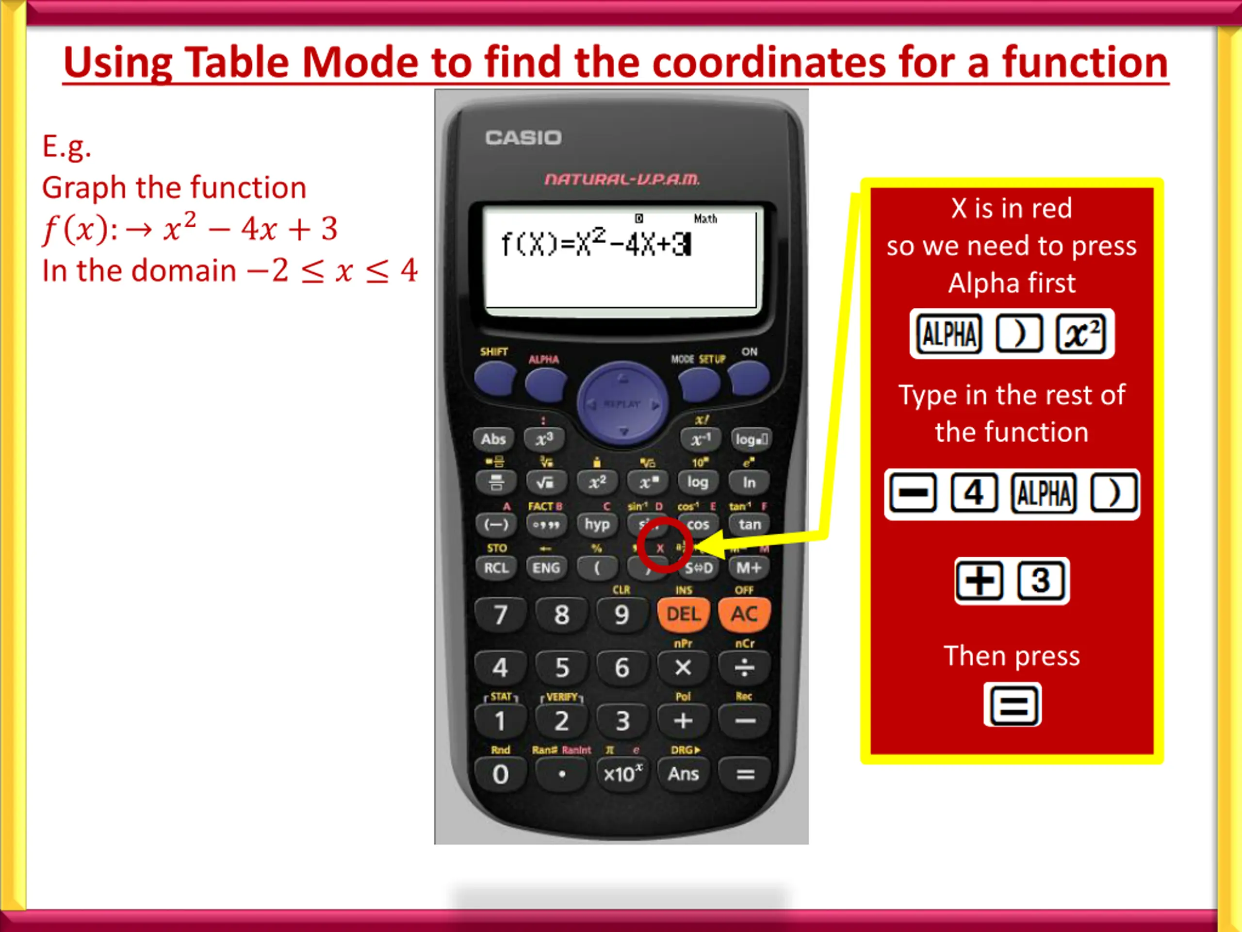Using Table Mode to find the coordinates for a function E.g. Graph the function ? ? : ?2 4? + 3 In the domain 2 ? 4 X is in red so we need to press Alpha first Type in the rest of the function Then press