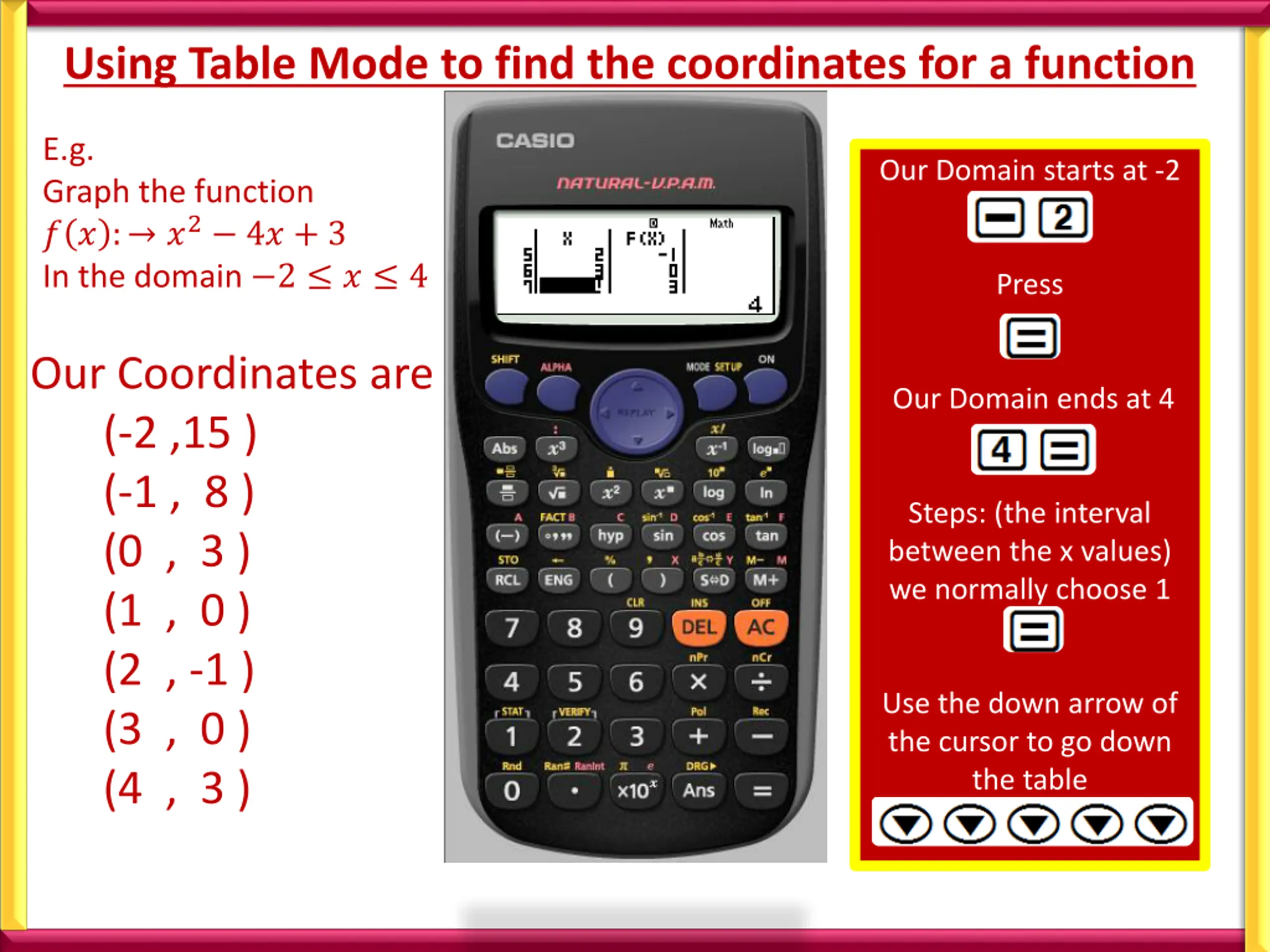 Using Table Mode to find the coordinates for a function E.g. Graph the function ? ? : ?2 4? + 3 In the domain 2 ? 4 Our Domain starts at -2 Press Our Coordinates are (-2 ,15 ) (-1 , 8 ) (0 , 3 ) (1 , 0 ) (2 , -1 ) (3 , 0 ) (4 , 3 ) Our Domain ends at 4 Steps: (the interval between the x values) we normally choose 1 Use the down arrow of the cursor to go down the table