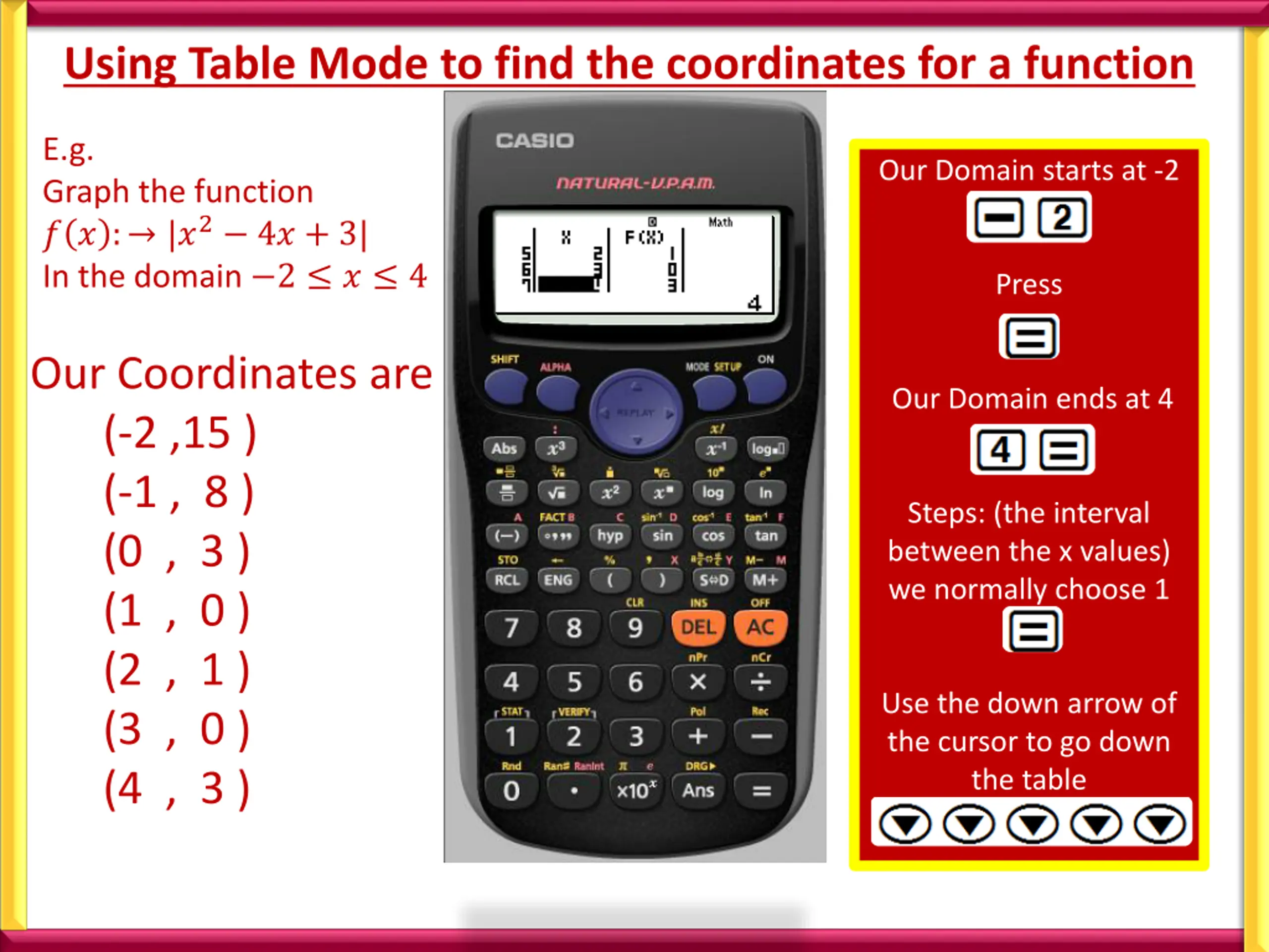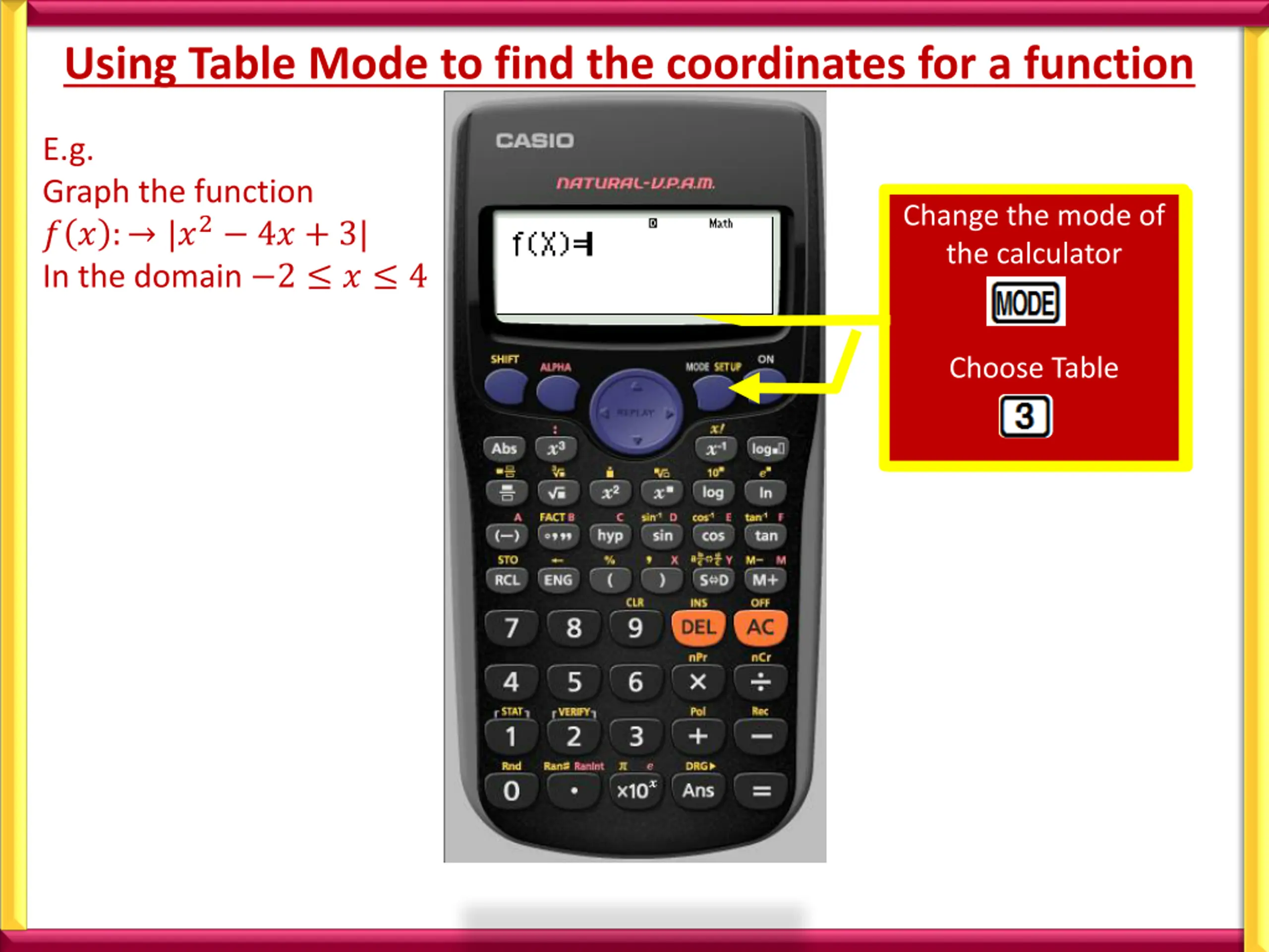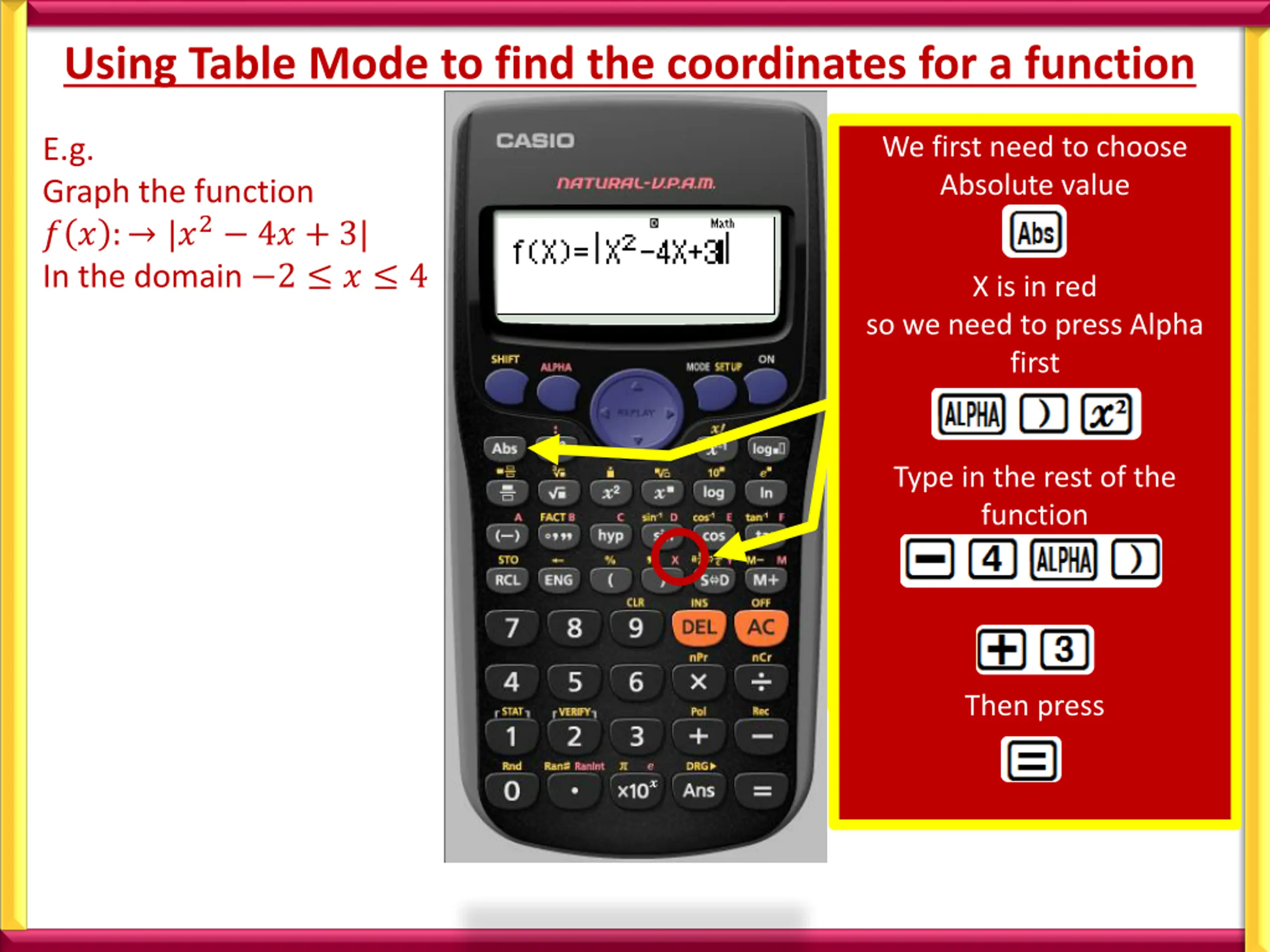 Using Table Mode to find the coordinates for a function We first need to choose Absolute value Absolute value We first need to choose E.g. Graph the function ? ? : |?2 4? + 3| In the domain 2 ? 4 X is in red so we need to press Alpha first Type in the rest of the function Then press