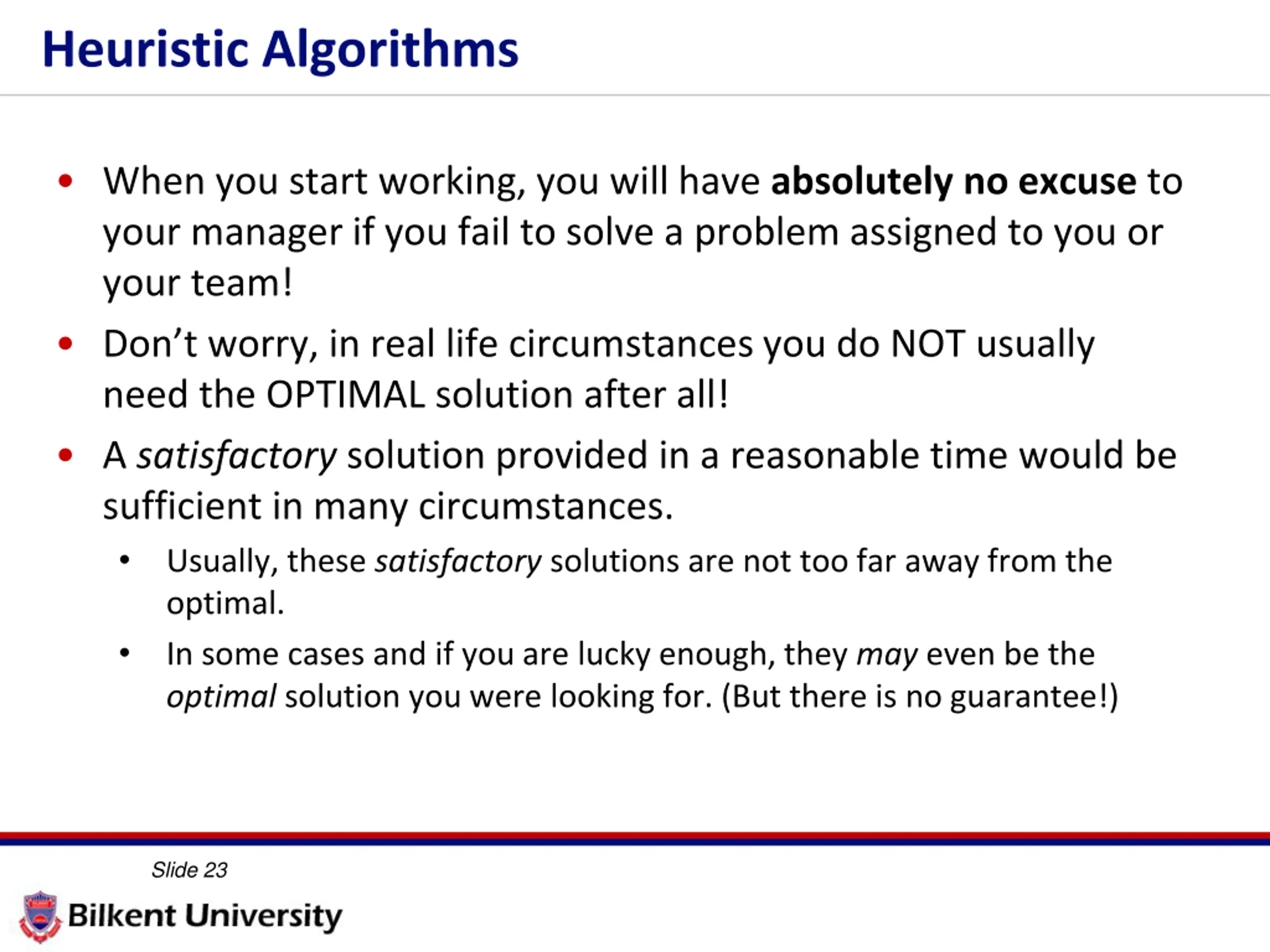 Heuristic Algorithms When you start working, you will have absolutely no excuse to your manager if you fail to solve a problem assigned to you or your team! Don t worry, in real life circumstances you do NOT usually need the OPTIMAL solution after all! A satisfactory solution provided in a reasonable time would be sufficient in many circumstances. Usually, these satisfactory solutions are not too far away from the optimal. In some cases and if you are lucky enough, they may even be the optimal solution you were looking for. (But there is no guarantee!) Slide 23