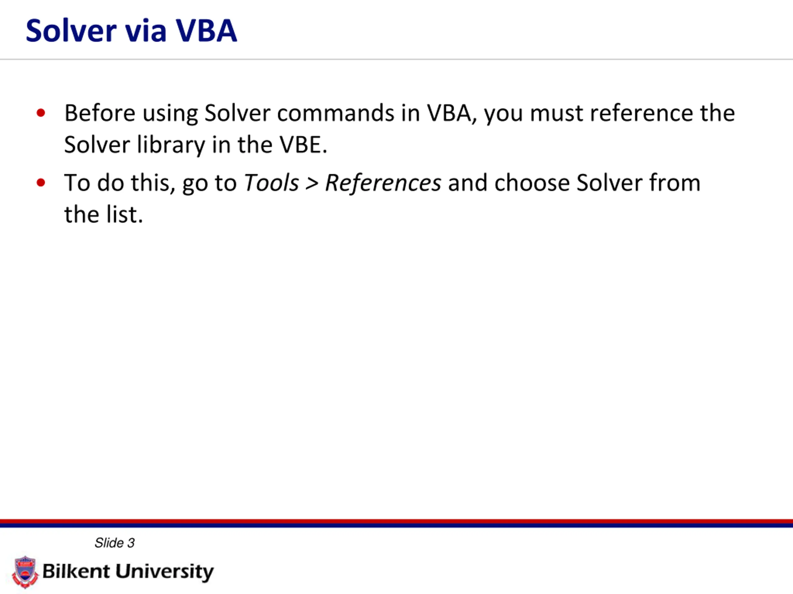 Solver via VBA Before using Solver commands in VBA, you must reference the Solver library in the VBE. To do this, go to Tools > References and choose Solver from the list. Slide 3