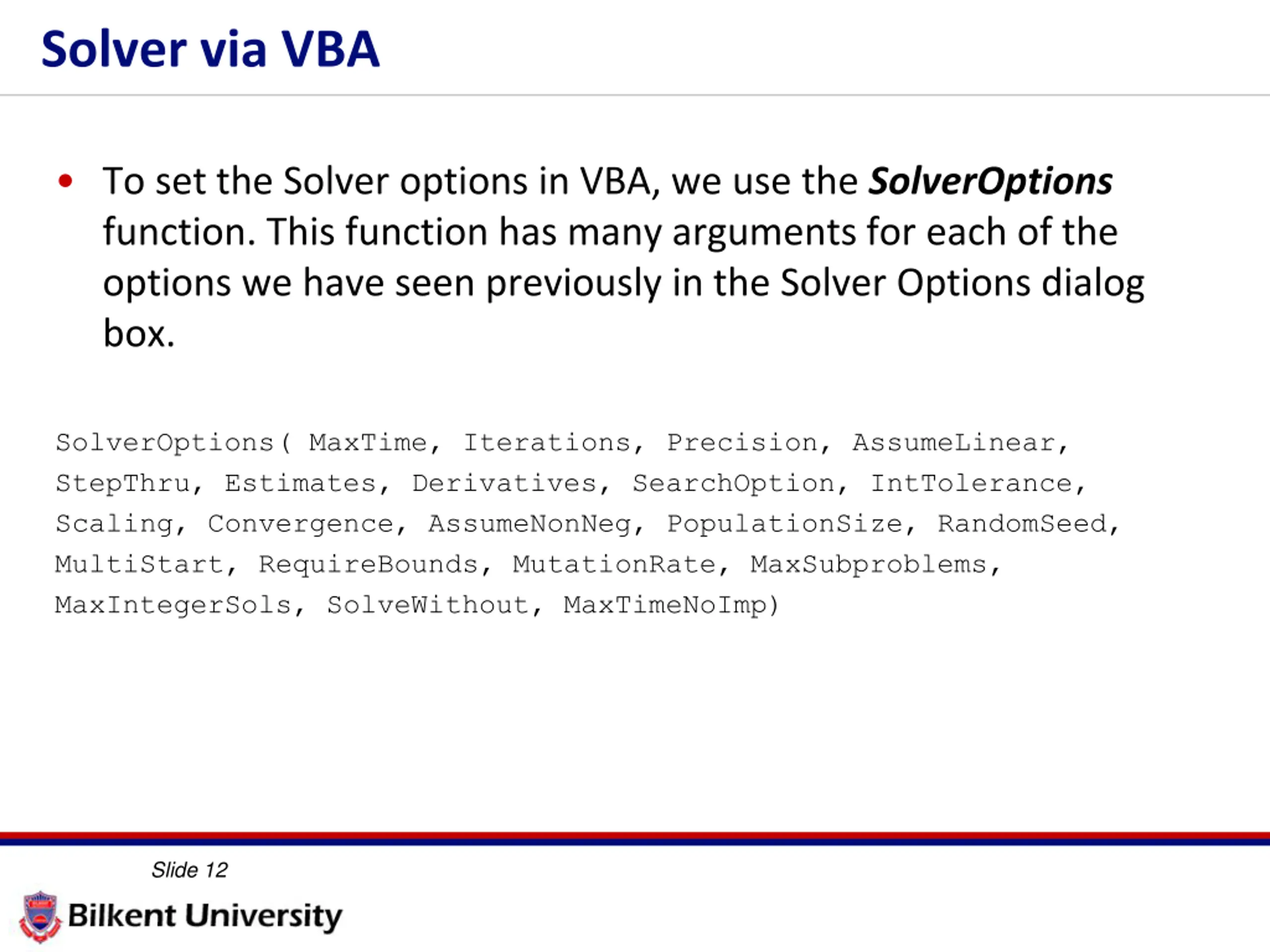 Solver via VBA To set the Solver options in VBA, we use the SolverOptions function. This function has many arguments for each of the options we have seen previously in the Solver Options dialog box. SolverOptions( MaxTime, Iterations, Precision, AssumeLinear, StepThru, Estimates, Derivatives, SearchOption, IntTolerance, Scaling, Convergence, AssumeNonNeg, PopulationSize, RandomSeed, MultiStart, RequireBounds, MutationRate, MaxSubproblems, MaxIntegerSols, SolveWithout, MaxTimeNoImp) Slide 12