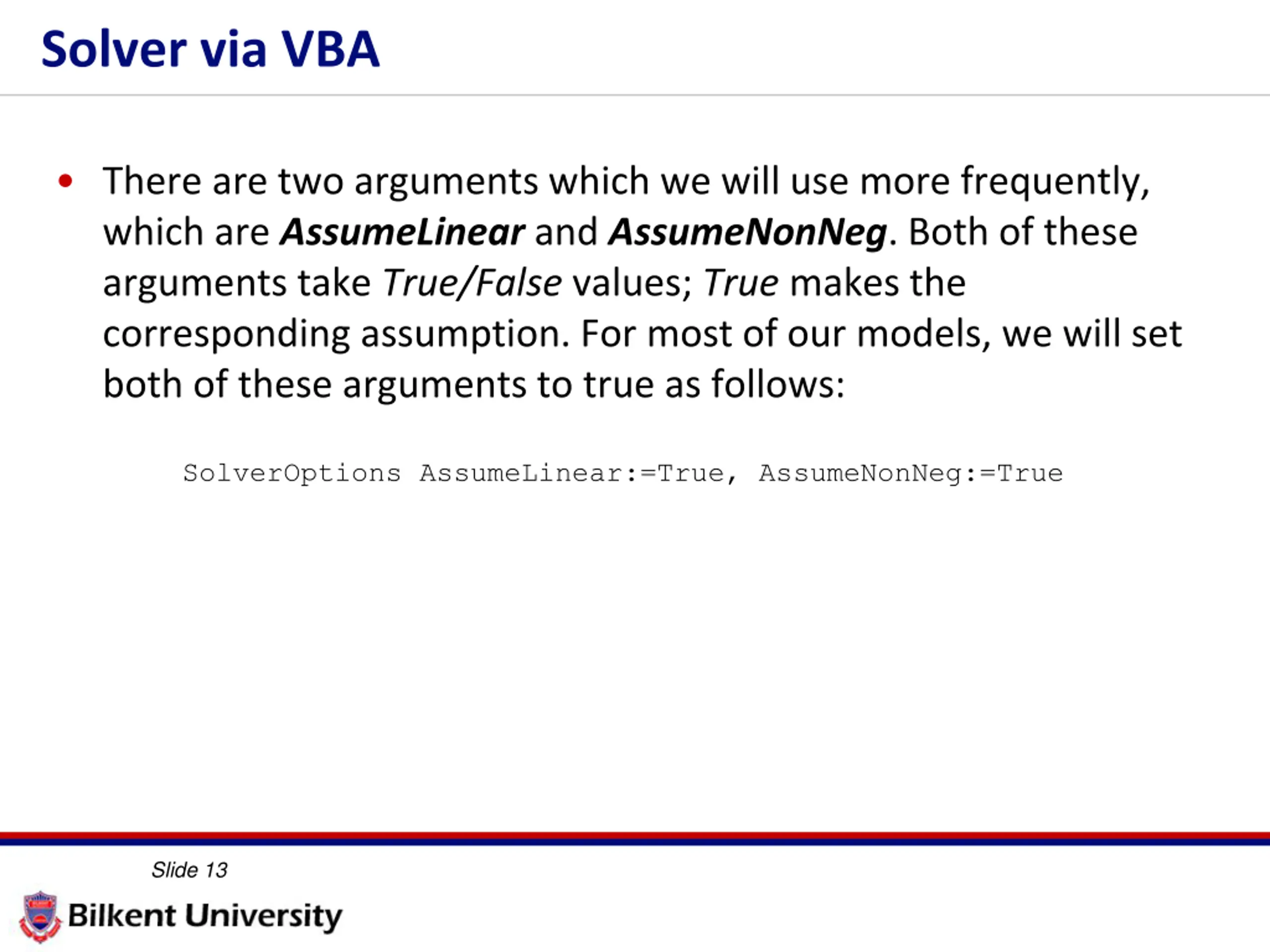 Solver via VBA There are two arguments which we will use more frequently, which are AssumeLinear and AssumeNonNeg. Both of these arguments take True/False values; True makes the corresponding assumption. For most of our models, we will set both of these arguments to true as follows: SolverOptions AssumeLinear:=True, AssumeNonNeg:=True Slide 13