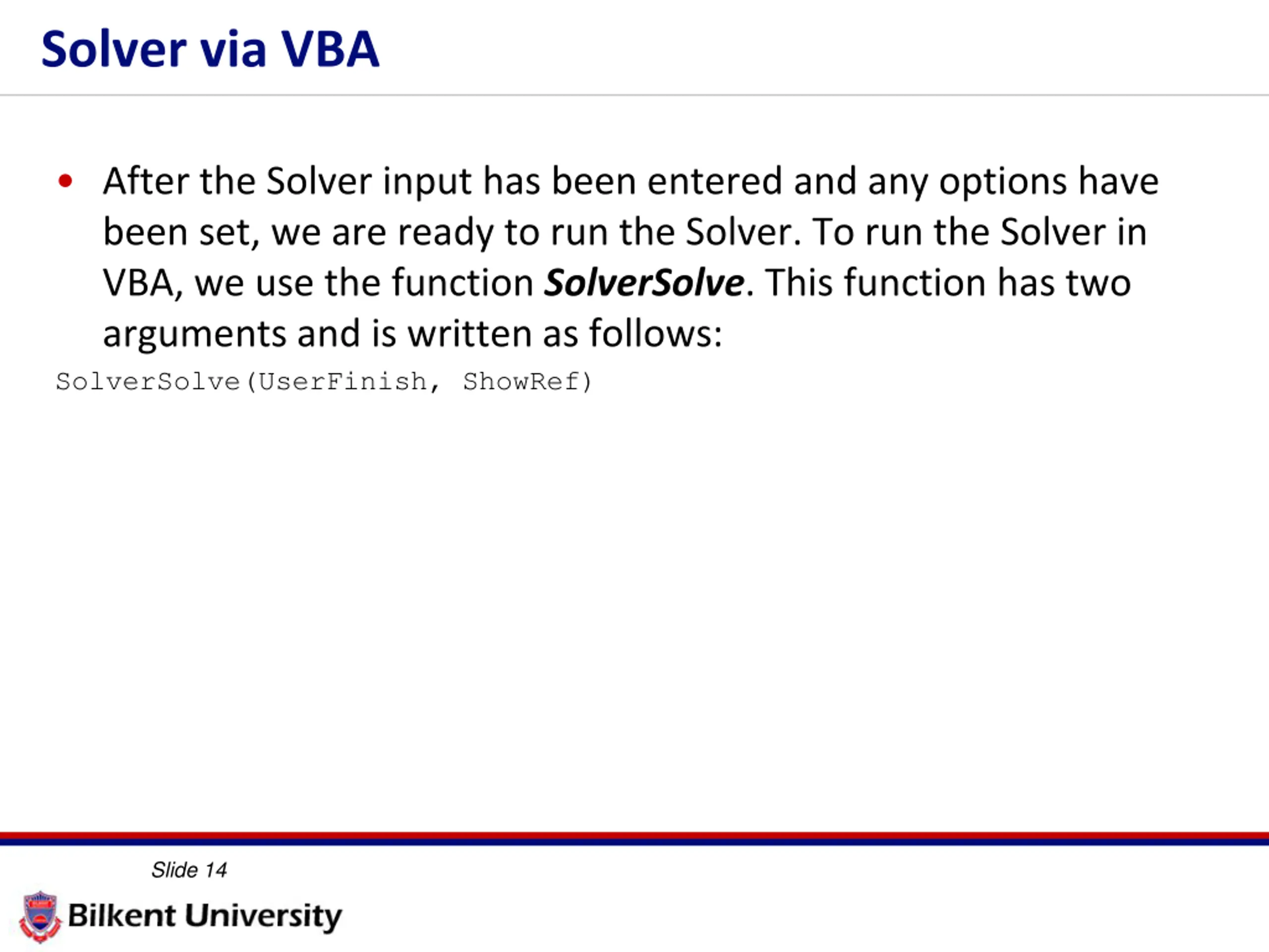 Solver via VBA After the Solver input has been entered and any options have been set, we are ready to run the Solver. To run the Solver in VBA, we use the function SolverSolve. This function has two arguments and is written as follows: SolverSolve(UserFinish, ShowRef) Slide 14