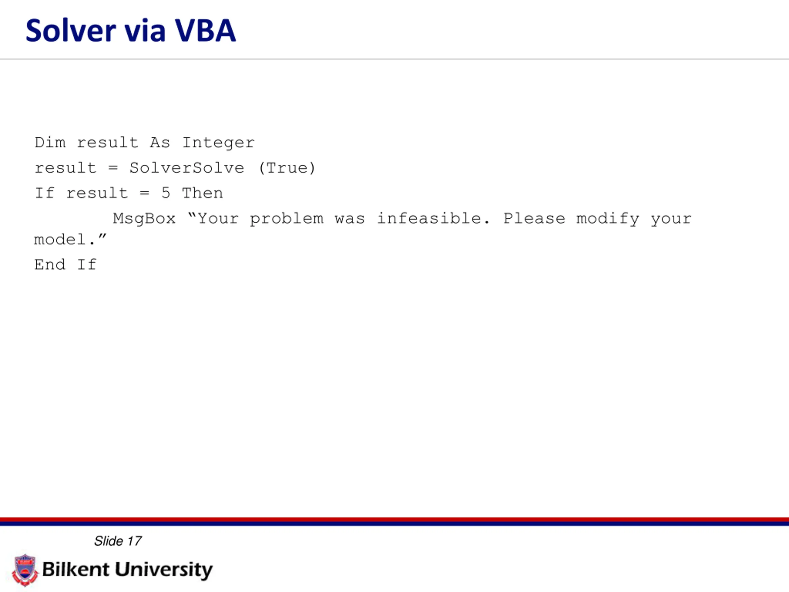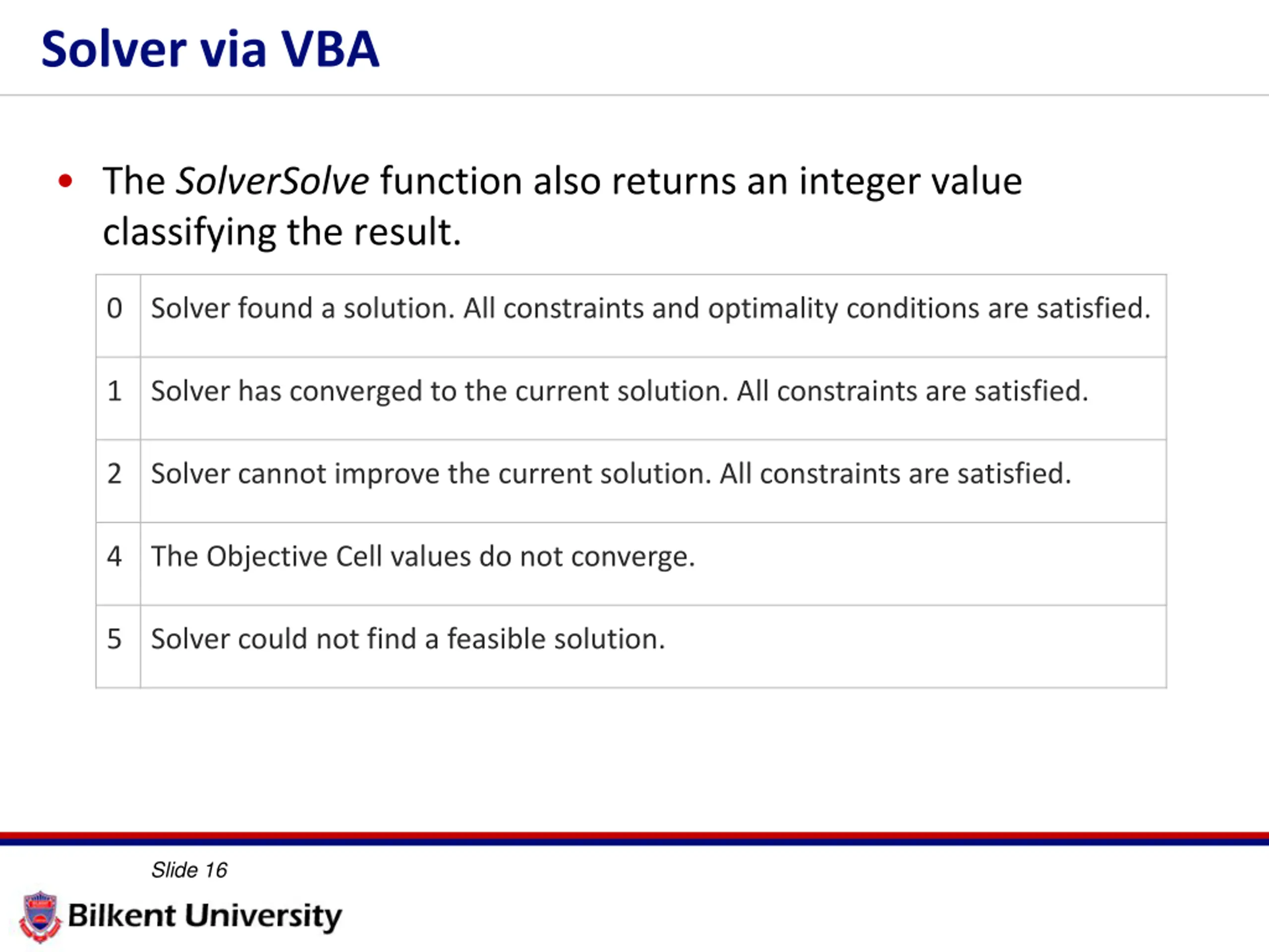 Solver via VBA The SolverSolve function also returns an integer value classifying the result. 0 Solver found a solution. All constraints and optimality conditions are satisfied. 1 Solver has converged to the current solution. All constraints are satisfied. 2 Solver cannot improve the current solution. All constraints are satisfied. 4 The Objective Cell values do not converge. 5 Solver could not find a feasible solution. Slide 16