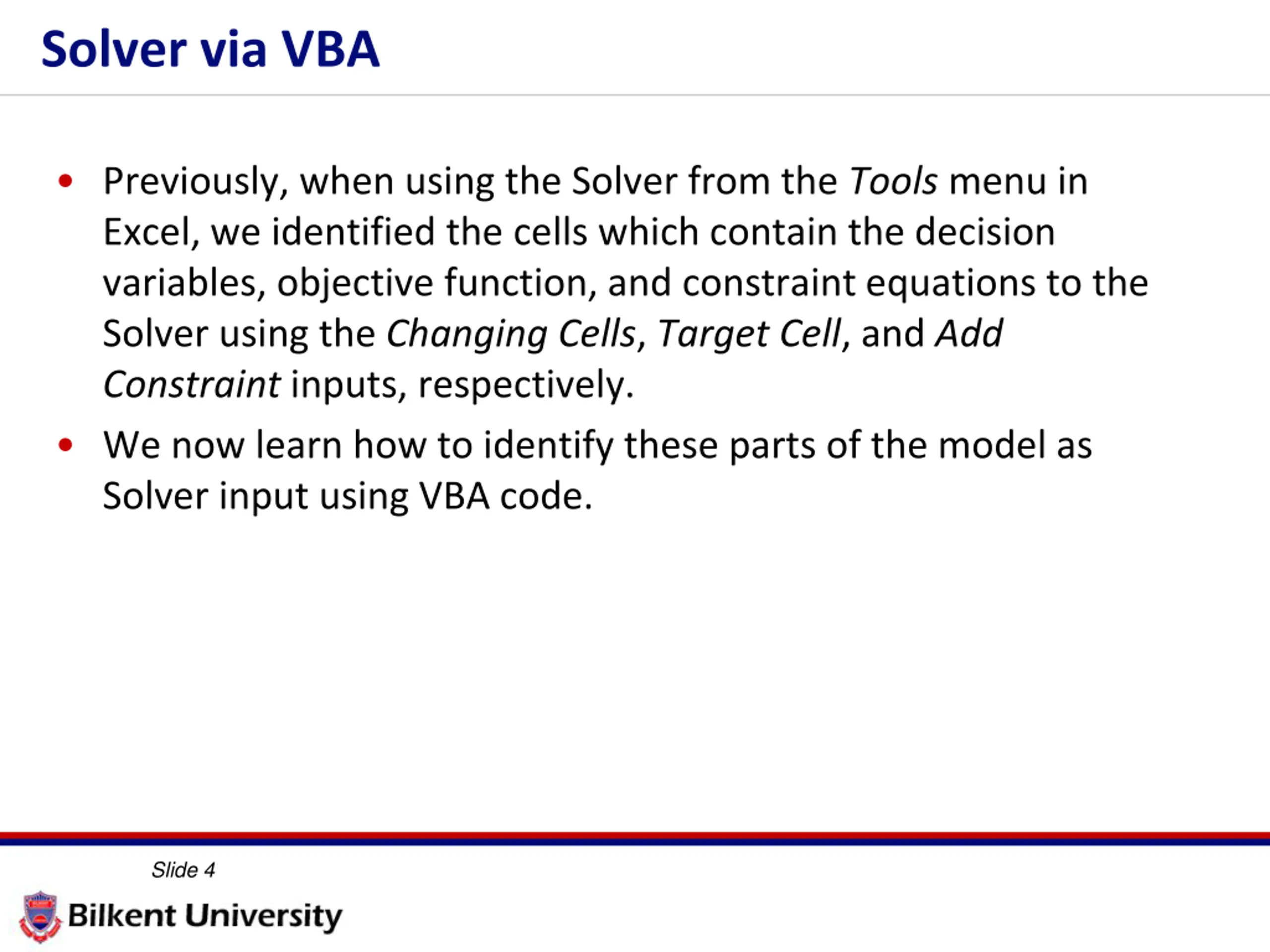 Solver via VBA Previously, when using the Solver from the Tools menu in Excel, we identified the cells which contain the decision variables, objective function, and constraint equations to the Solver using the Changing Cells, Target Cell, and Add Constraint inputs, respectively. We now learn how to identify these parts of the model as Solver input using VBA code. Slide 4