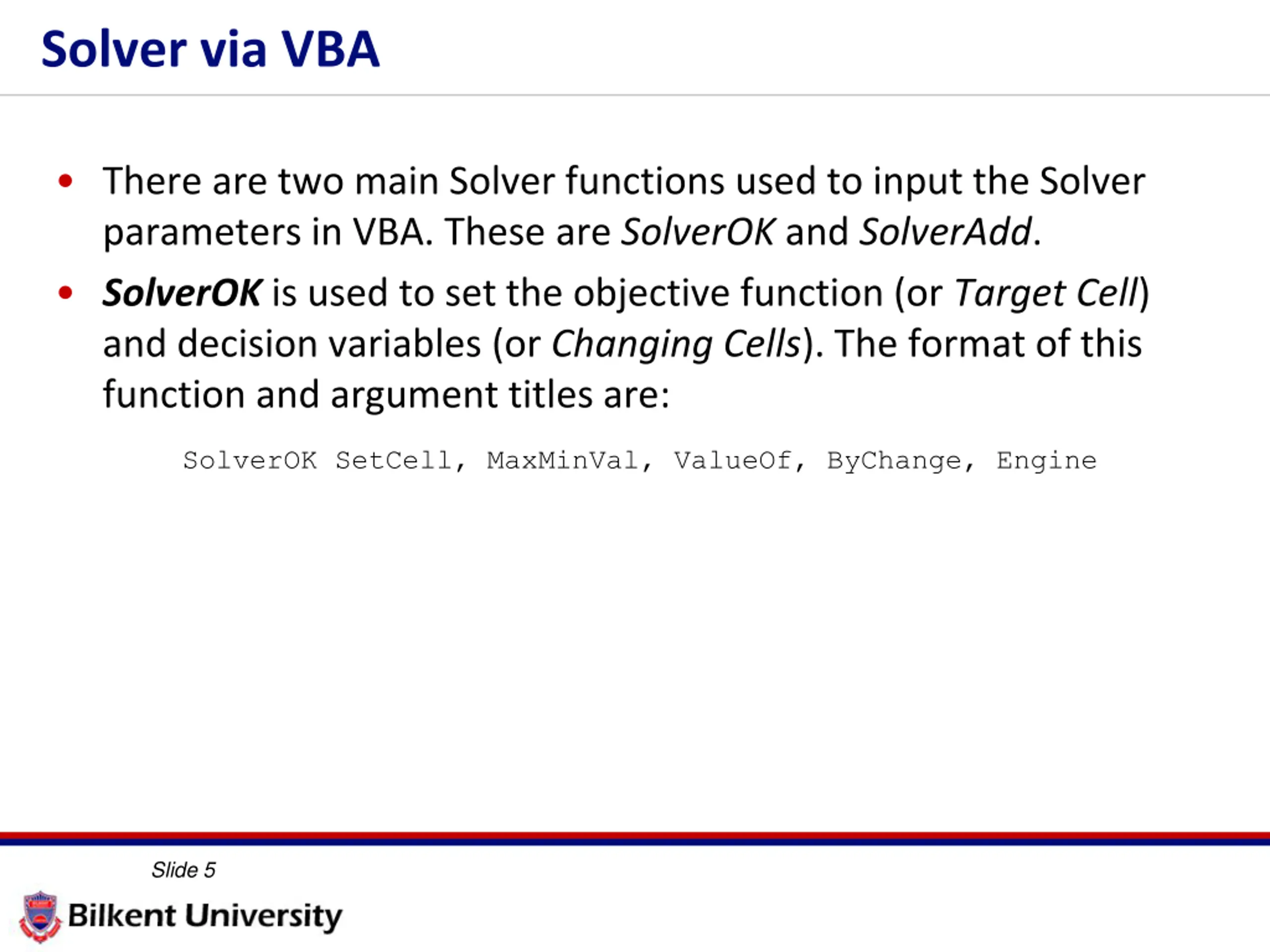 Solver via VBA There are two main Solver functions used to input the Solver parameters in VBA. These are SolverOK and SolverAdd. SolverOK is used to set the objective function (or Target Cell) and decision variables (or Changing Cells). The format of this function and argument titles are: SolverOK SetCell, MaxMinVal, ValueOf, ByChange, Engine Slide 5