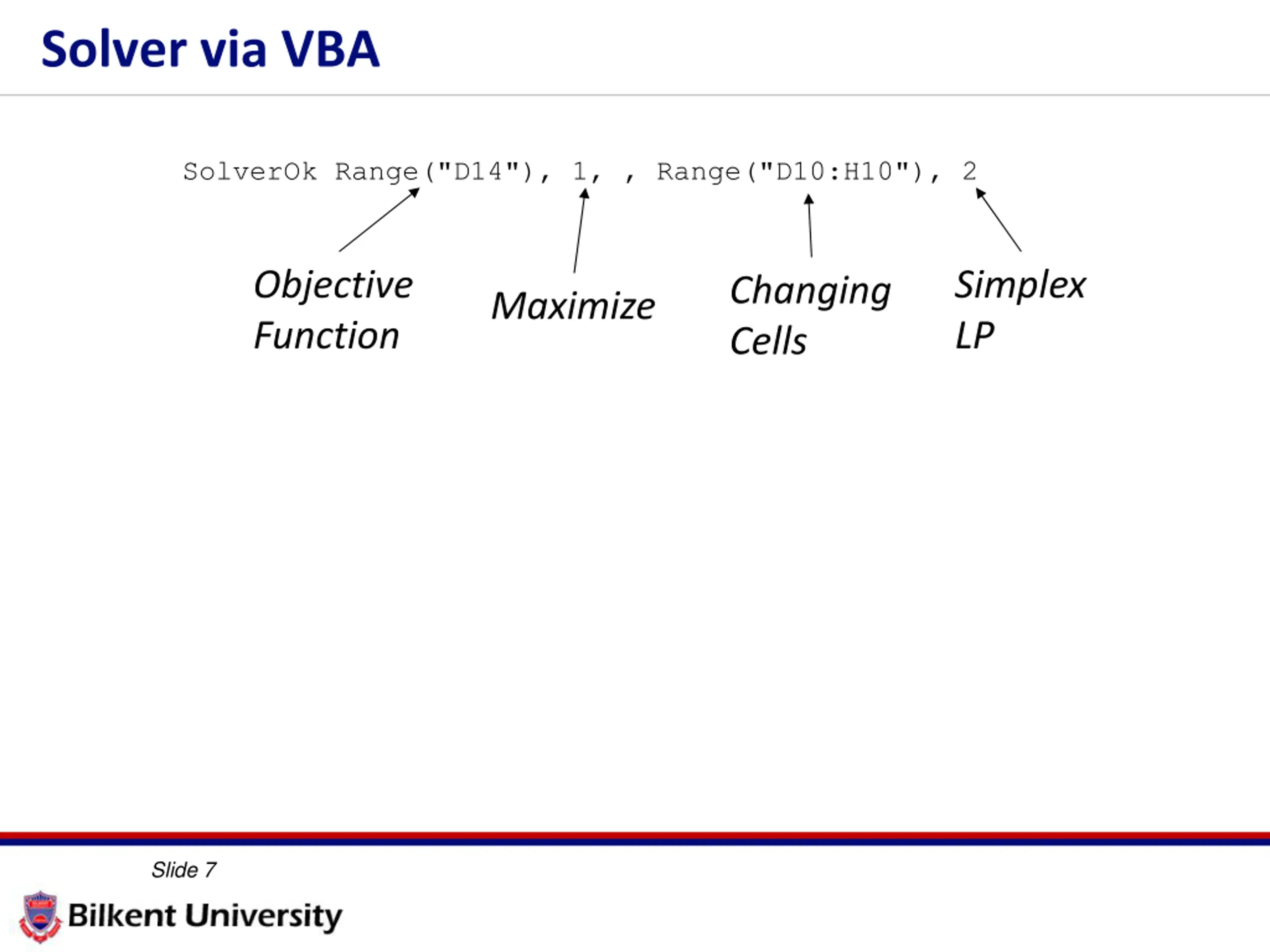 Solver via VBA SolverOk Range("D14"), 1, , Range("D10:H10"), 2 Objective Function Simplex LP Changing Cells Maximize Slide 7