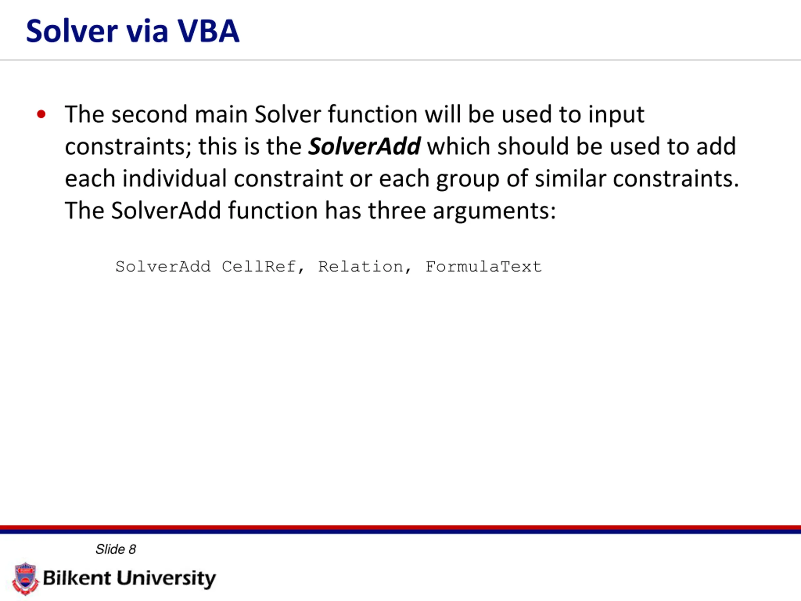 Solver via VBA The second main Solver function will be used to input constraints; this is the SolverAdd which should be used to add each individual constraint or each group of similar constraints. The SolverAdd function has three arguments: SolverAdd CellRef, Relation, FormulaText Slide 8