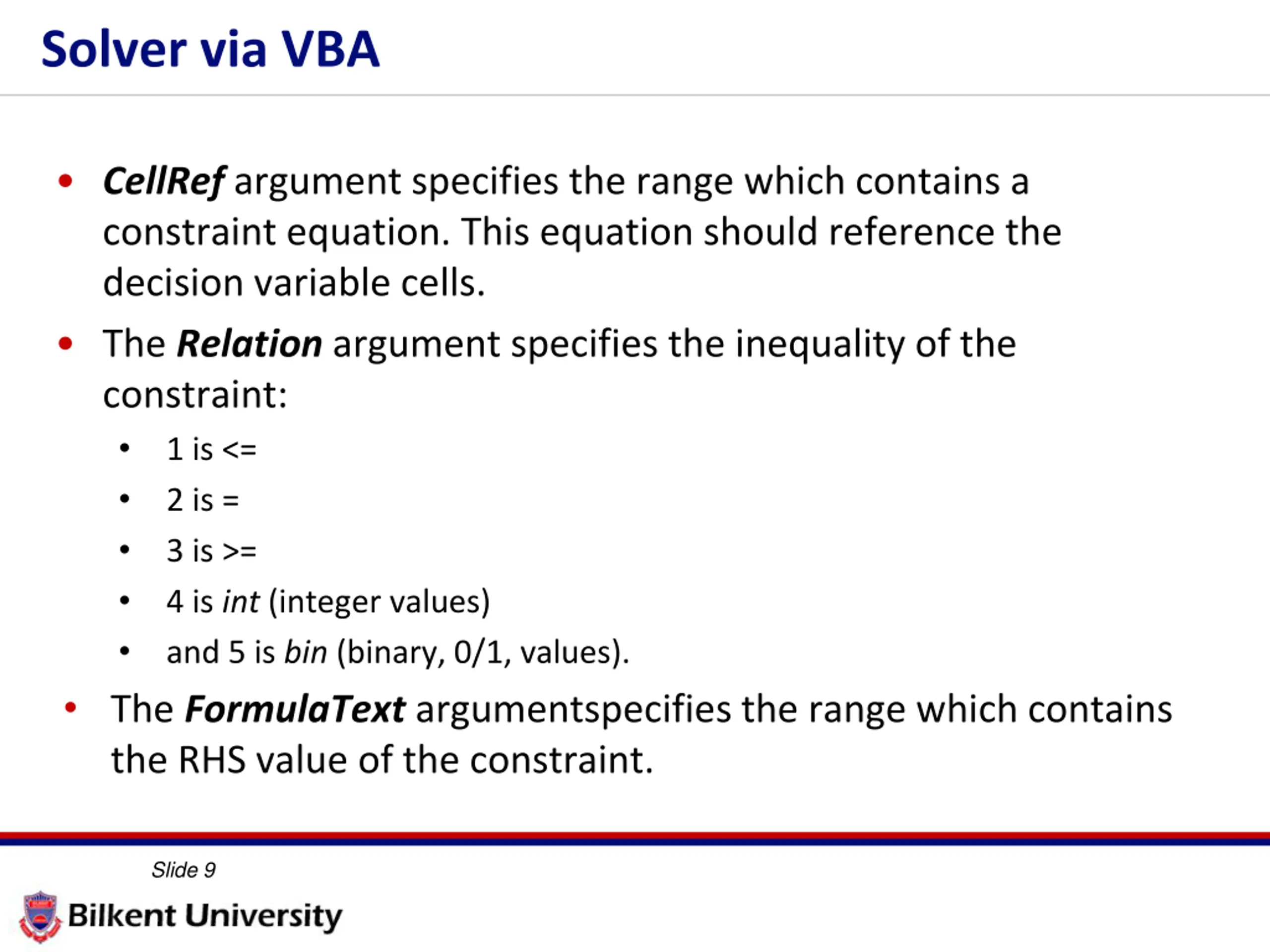 Solver via VBA CellRef argument specifies the range which contains a constraint equation. This equation should reference the decision variable cells. The Relation argument specifies the inequality of the constraint: 1 is <= 2 is = 3 is >= 4 is int (integer values) and 5 is bin (binary, 0/1, values). The FormulaText argumentspecifies the range which contains the RHS value of the constraint. Slide 9