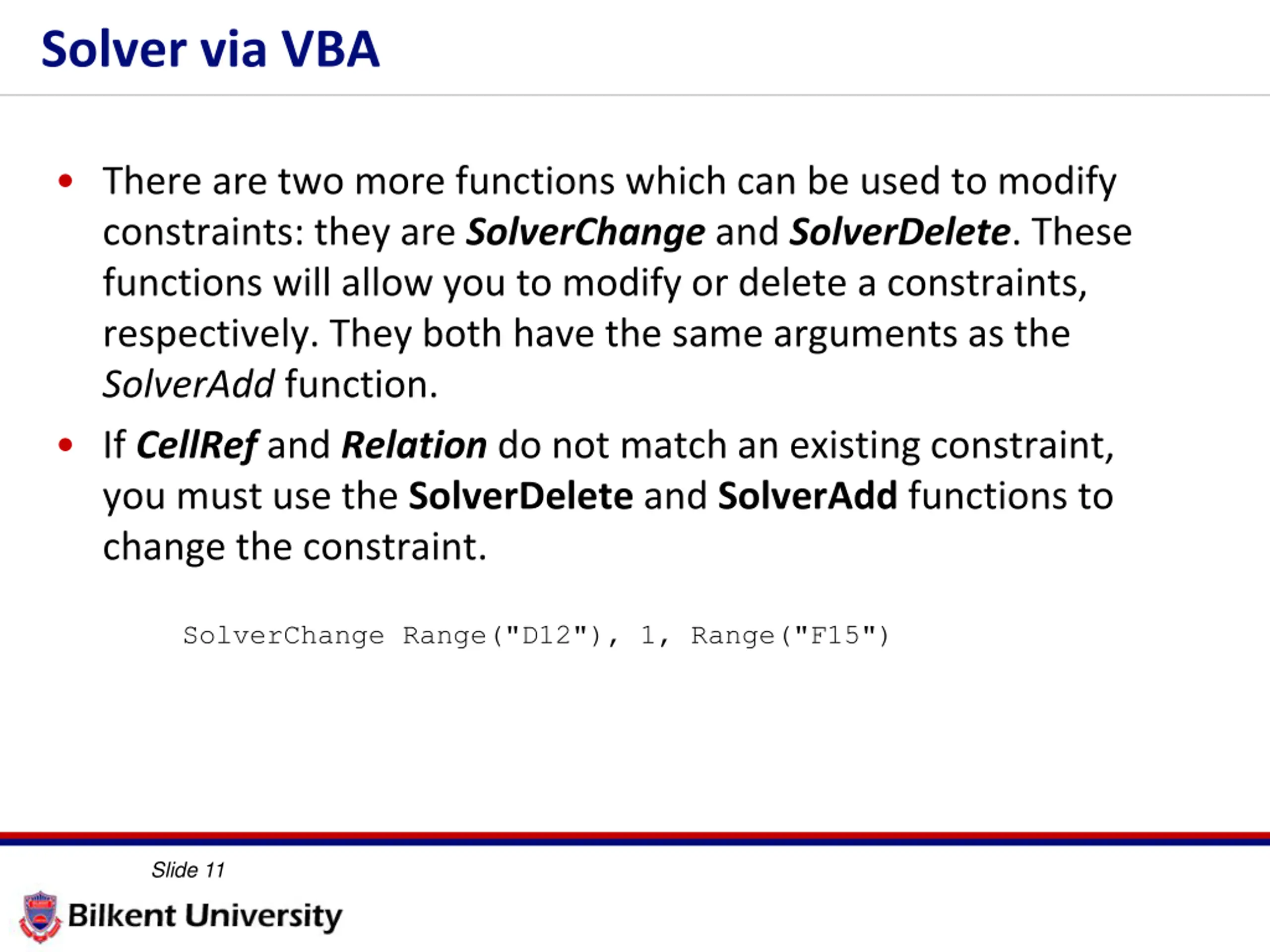 Solver via VBA There are two more functions which can be used to modify constraints: they are SolverChange and SolverDelete. These functions will allow you to modify or delete a constraints, respectively. They both have the same arguments as the SolverAdd function. If CellRef and Relation do not match an existing constraint, you must use the SolverDelete and SolverAdd functions to change the constraint. SolverChange Range("D12"), 1, Range("F15") Slide 11