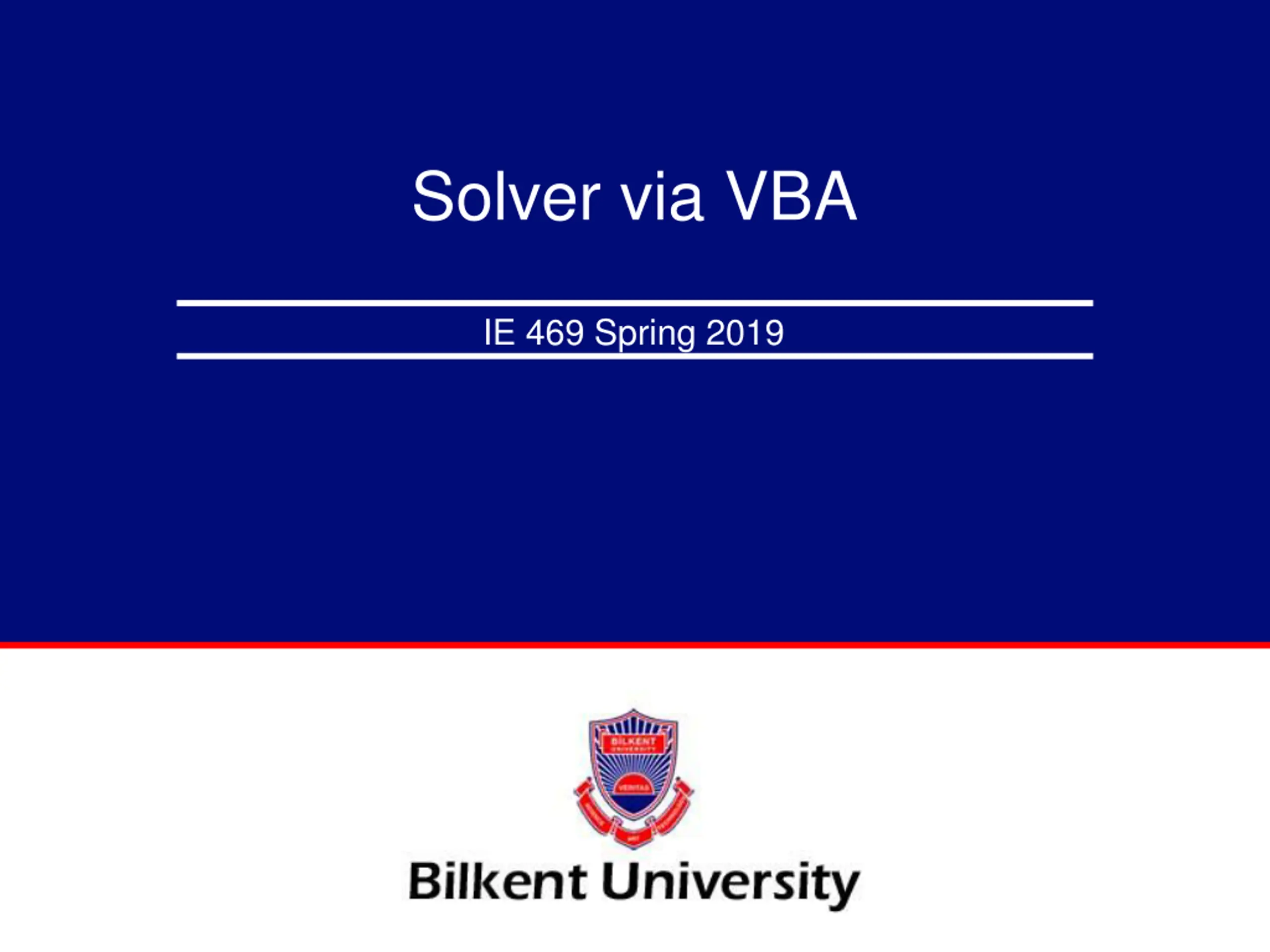 Why do we need to use VBA to call solver? When you work with more complex codes that includes optimization, it is a good idea to embed solver commands into the VBA code. VBA has functions to run Solver. BUT! You need to have the problem setup on the worksheet just as we did before. Afterwards, you can use the VBA Solver functions to setup the solver i.e., filling in the parameters in the Solver Dialog Box via VBA Slide 2