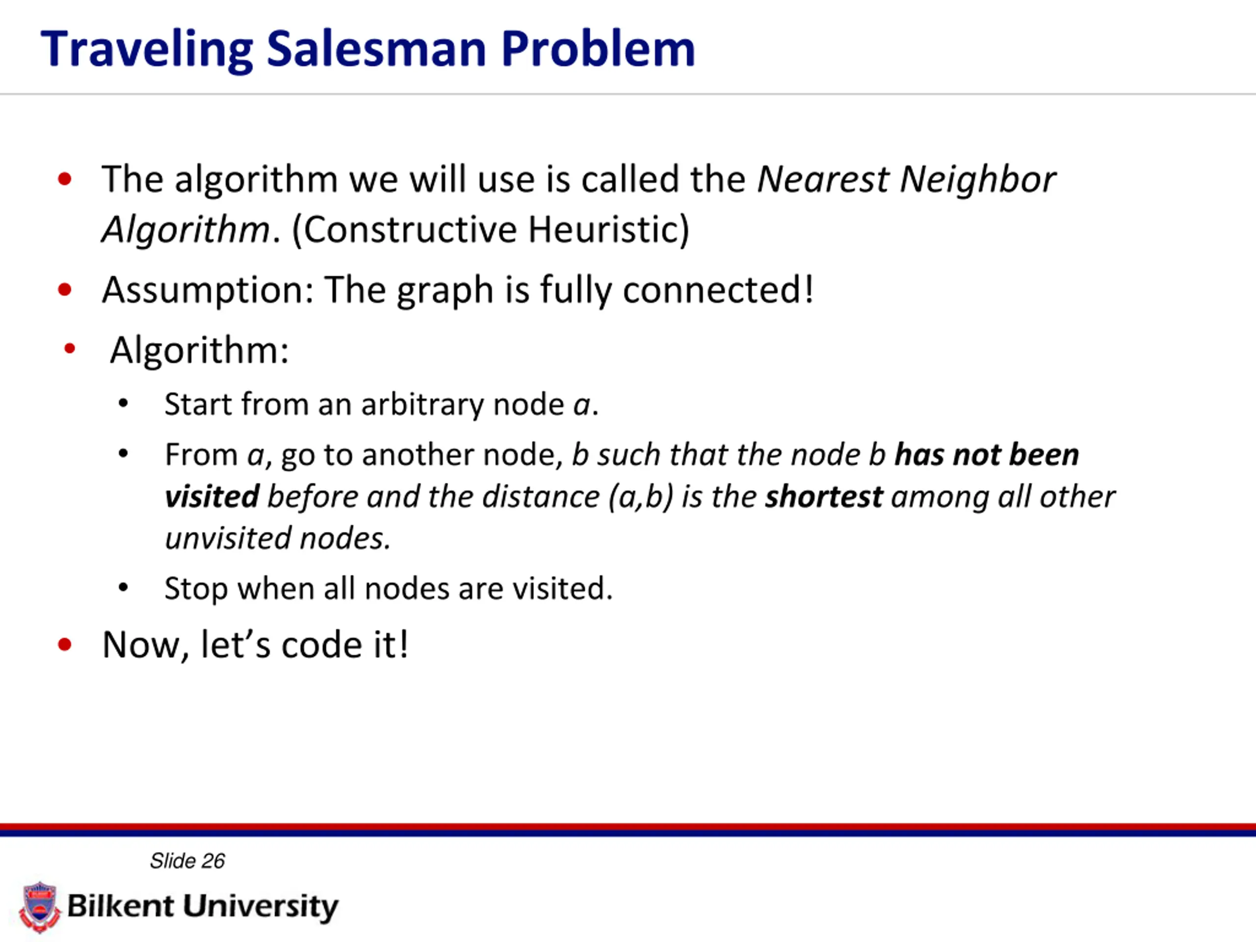 Traveling Salesman Problem The algorithm we will use is called the Nearest Neighbor Algorithm. (Constructive Heuristic) Assumption: The graph is fully connected! Algorithm: Start from an arbitrary node a. From a, go to another node, b such that the node b has not been visited before and the distance (a,b) is the shortest among all other unvisited nodes. Stop when all nodes are visited. Now, let s code it! Slide 26