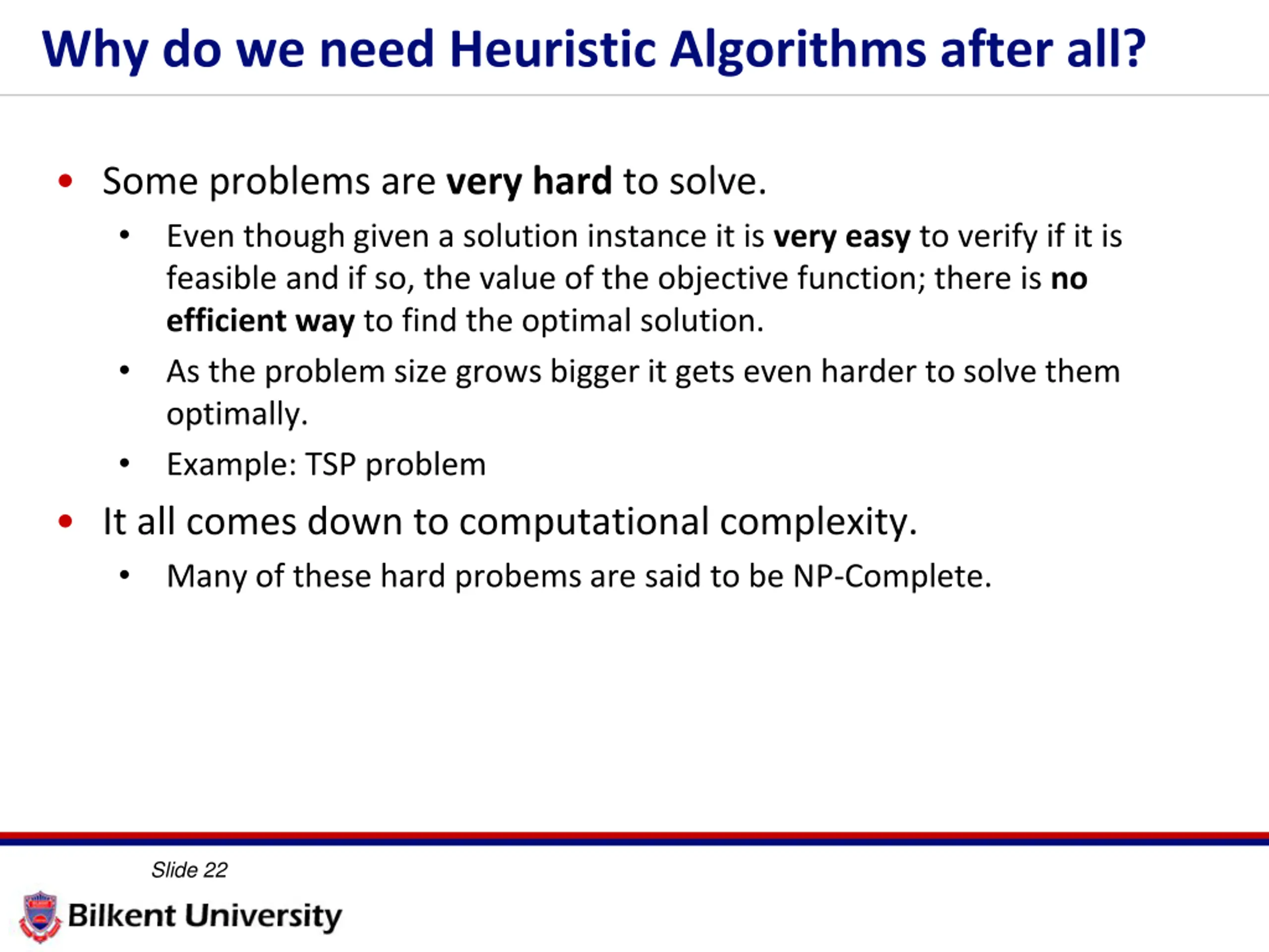 Why do we need Heuristic Algorithms after all? Some problems are very hard to solve. Even though given a solution instance it is very easy to verify if it is feasible and if so, the value of the objective function; there is no efficient way to find the optimal solution. As the problem size grows bigger it gets even harder to solve them optimally. Example: TSP problem It all comes down to computational complexity. Many of these hard probems are said to be NP-Complete. Slide 22