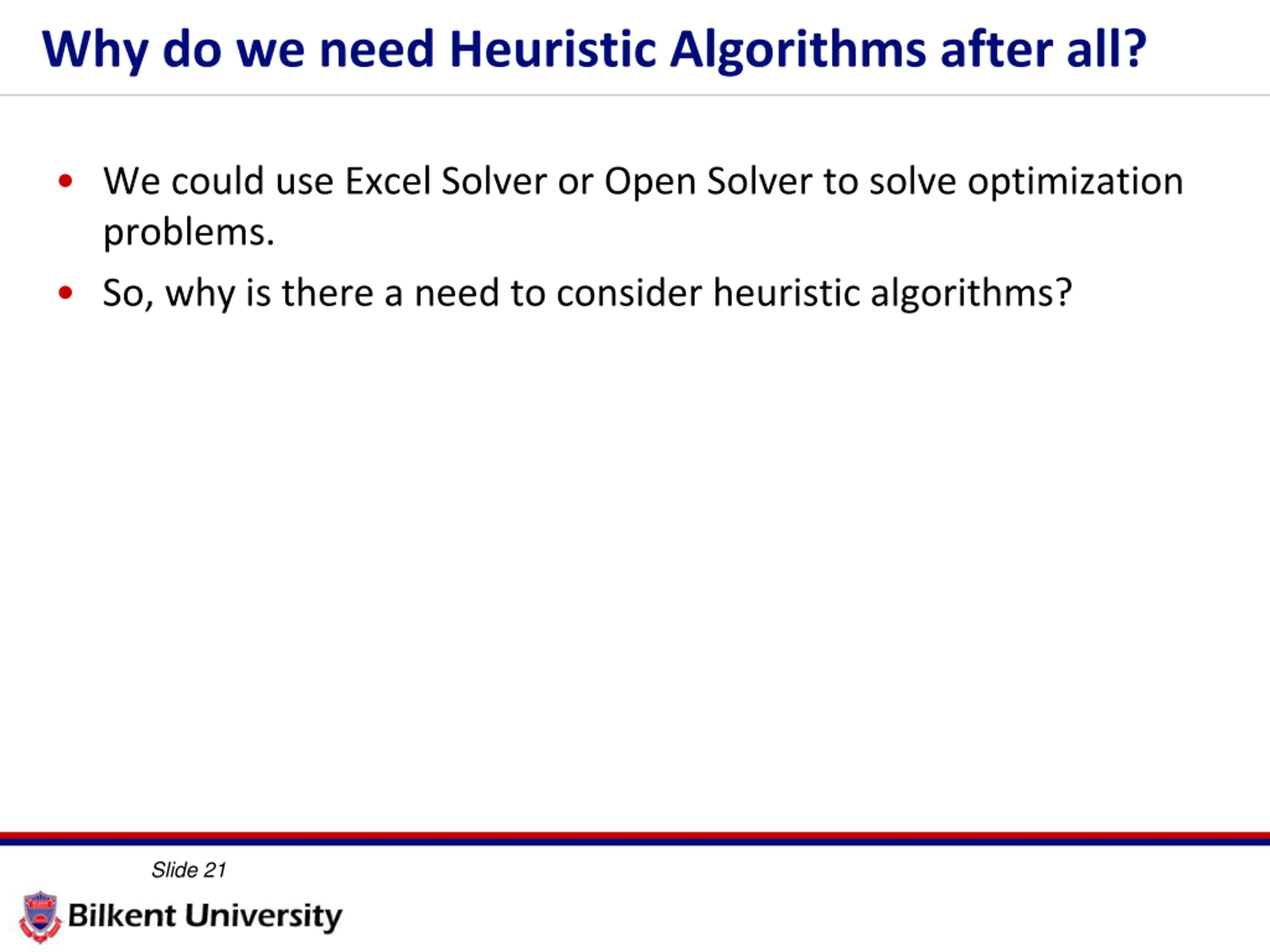 Why do we need Heuristic Algorithms after all? We could use Excel Solver or Open Solver to solve optimization problems. So, why is there a need to consider heuristic algorithms? Slide 21