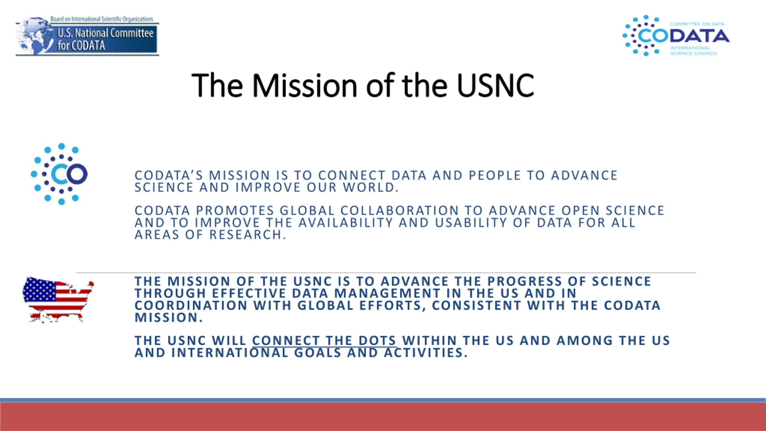 CODATA, The Committee on Data for Science and Technology USNC in Context USNC in Context Sponsored by the US National Academies of Science, Engineering and Medicine Reconstituted June 2020, with a very long historical tradition Part of the Board on International Scientific Organizations With USNCs from Scientific Unions Sister organization to the Board on Research Data and Information (BRDI) Funded by the US National Science Foundation with 5 year grant ending in 2024 Initially meeting quarterly; 3 virtual and first in person held April 2023