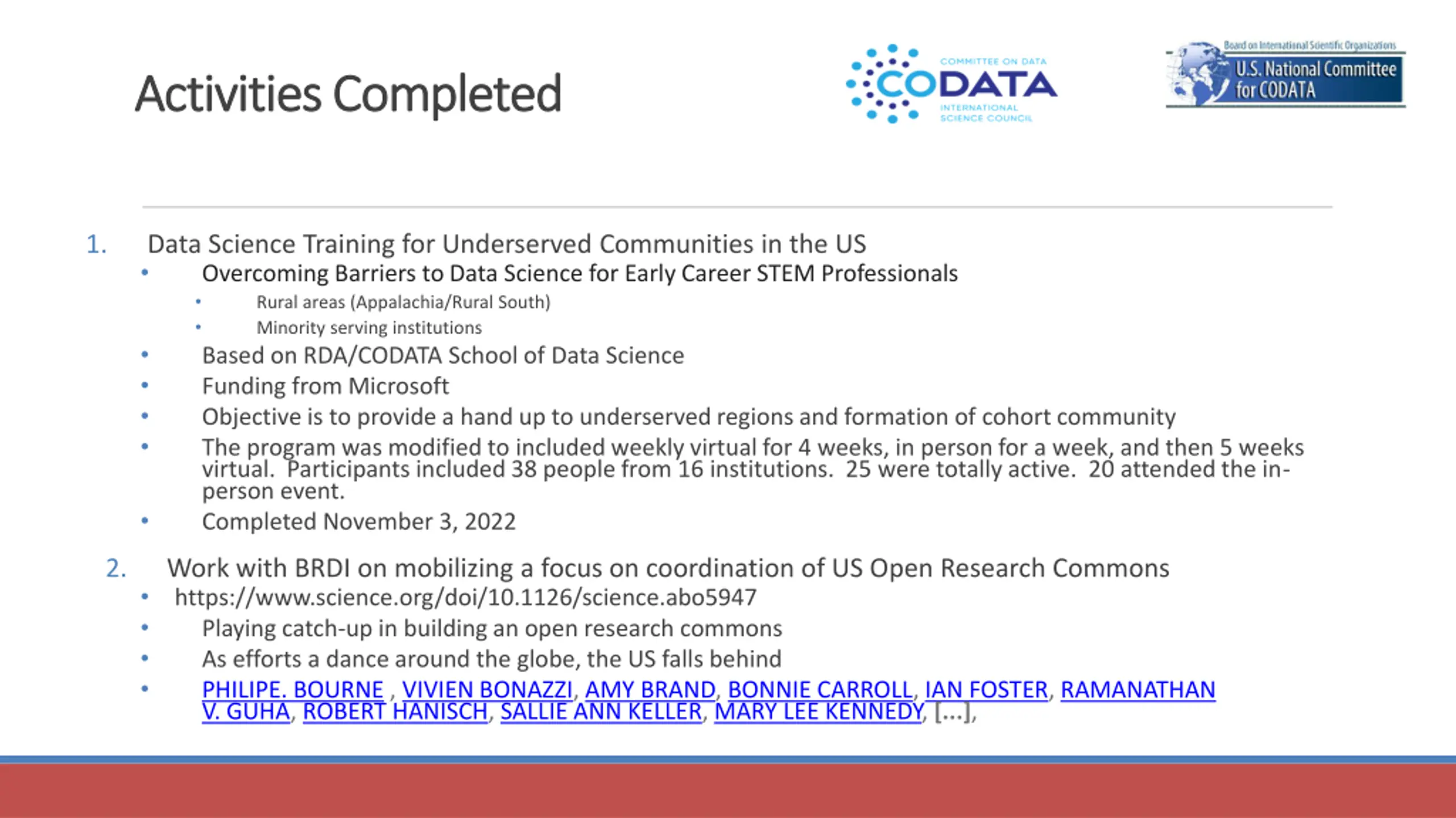 CODATA, The Committee on Data for Science and Technology Activities Completed Activities Completed 1. Data Science Training for Underserved Communities in the US Overcoming Barriers to Data Science for Early Career STEM Professionals Rural areas (Appalachia/Rural South) Minority serving institutions Based on RDA/CODATA School of Data Science Funding from Microsoft Objective is to provide a hand up to underserved regions and formation of cohort community The program was modified to included weekly virtual for 4 weeks, in person for a week, and then 5 weeks virtual. Participants included 38 people from 16 institutions. 25 were totally active. 20 attended the in- person event. Completed November 3, 2022 2. Work with BRDI on mobilizing a focus on coordination of US Open Research Commons https://www.science.org/doi/10.1126/science.abo5947 Playing catch-up in building an open research commons As efforts a dance around the globe, the US falls behind PHILIPE. BOURNE , VIVIEN BONAZZI, AMY BRAND, BONNIE CARROLL, IAN FOSTER, RAMANATHAN V. GUHA, ROBERT HANISCH, SALLIE ANN KELLER, MARY LEE KENNEDY, [...],