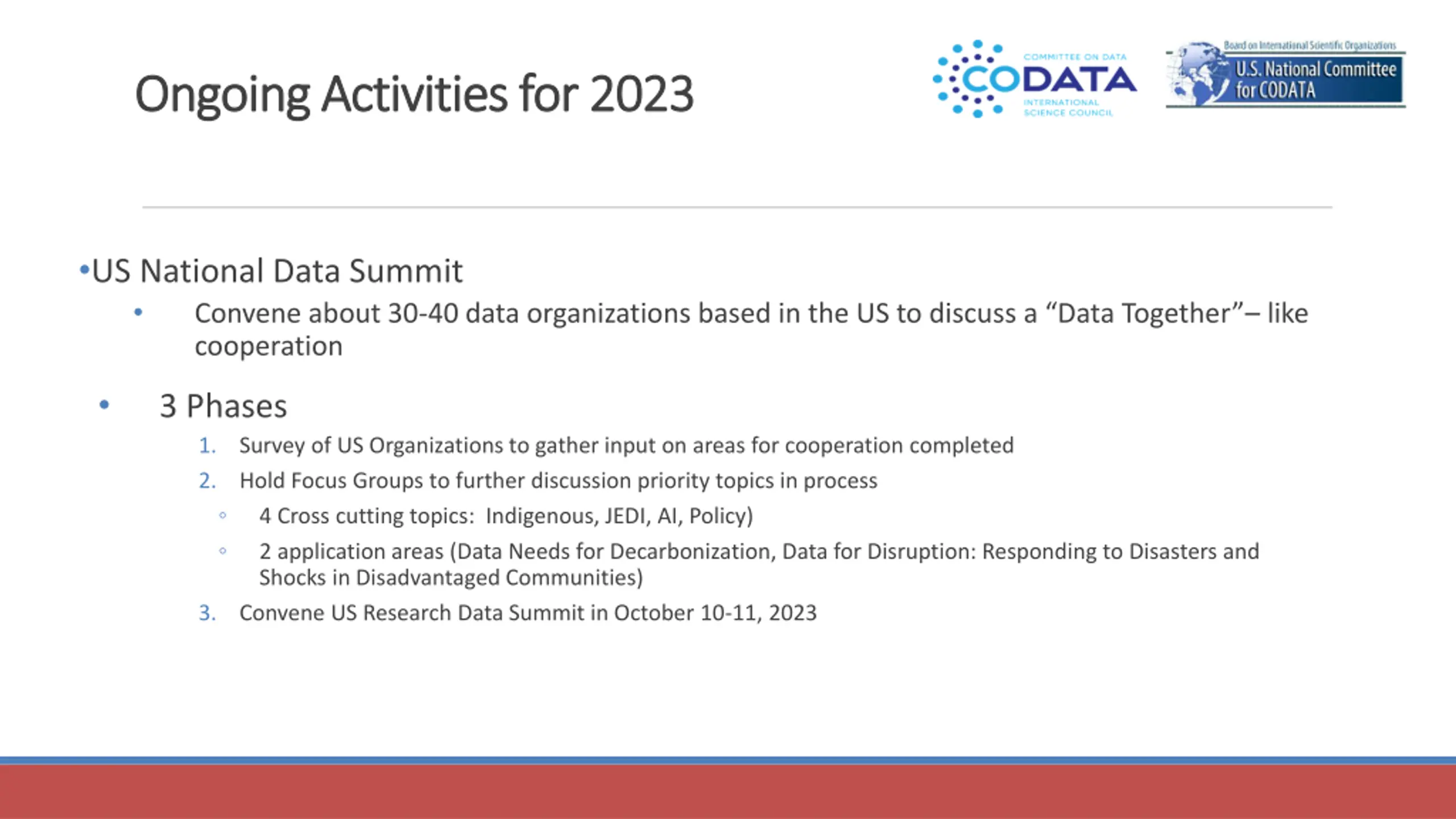 CODATA, The Committee on Data for Science and Technology Ongoing Activities for 2023 Ongoing Activities for 2023 US National Data Summit Convene about 30-40 data organizations based in the US to discuss a Data Together like cooperation 3 Phases 1. 2. Survey of US Organizations to gather input on areas for cooperation completed Hold Focus Groups to further discussion priority topics in process 4 Cross cutting topics: Indigenous, JEDI, AI, Policy) 2 application areas (Data Needs for Decarbonization, Data for Disruption: Responding to Disasters and Shocks in Disadvantaged Communities) Convene US Research Data Summit in October 10-11, 2023 3.