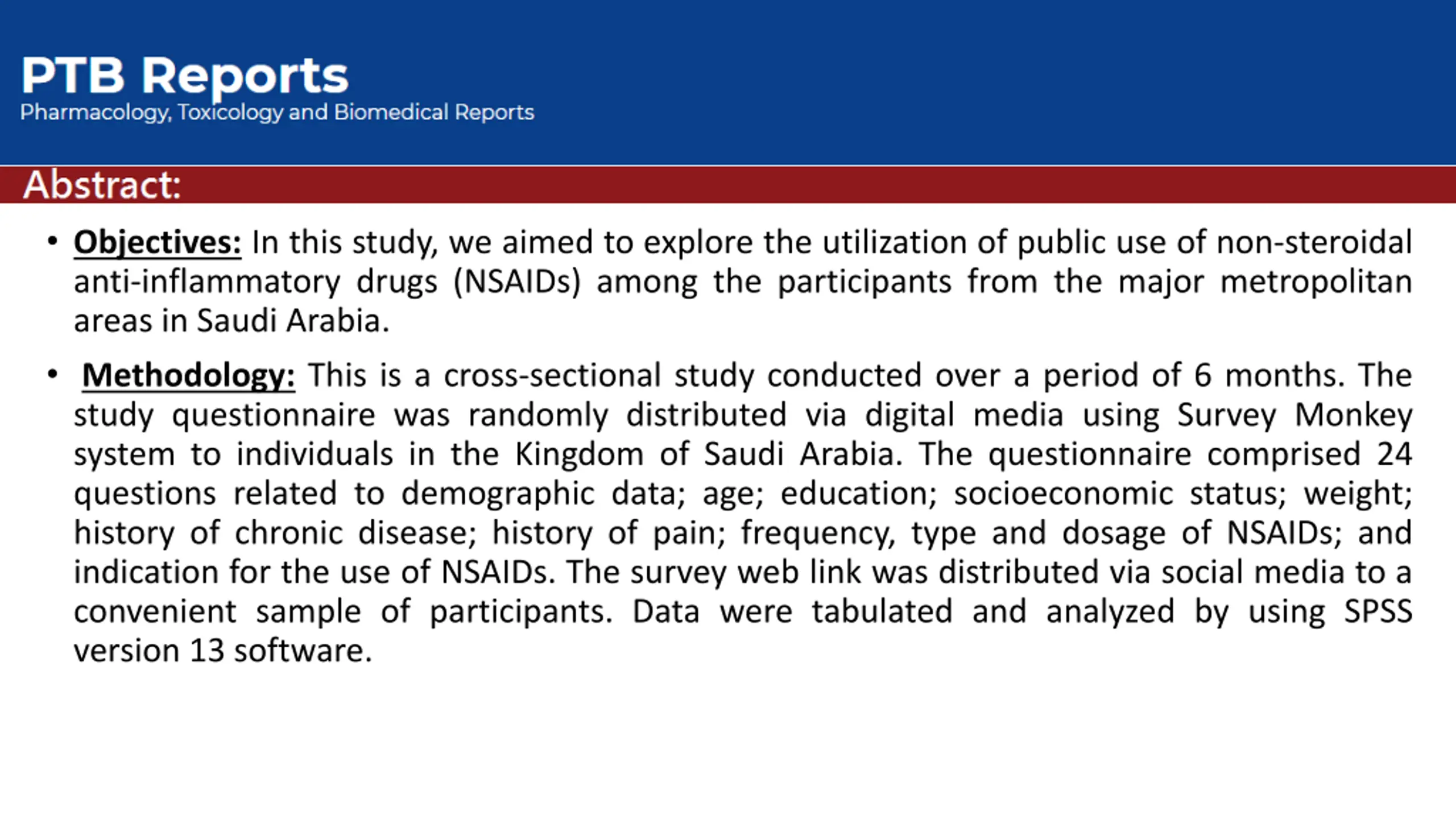 Objectives: In this study, we aimed to explore the utilization of public use of non-steroidal anti-inflammatory drugs (NSAIDs) among the participants from the major metropolitan areas in Saudi Arabia. Methodology: This is a cross-sectional study conducted over a period of 6 months. The study questionnaire was randomly distributed via digital media using Survey Monkey system to individuals in the Kingdom of Saudi Arabia. The questionnaire comprised 24 questions related to demographic data; age; education; socioeconomic status; weight; history of chronic disease; history of pain; frequency, type and dosage of NSAIDs; and indication for the use of NSAIDs. The survey web link was distributed via social media to a convenient sample of participants. Data were tabulated and analyzed by using SPSS version 13 software.
