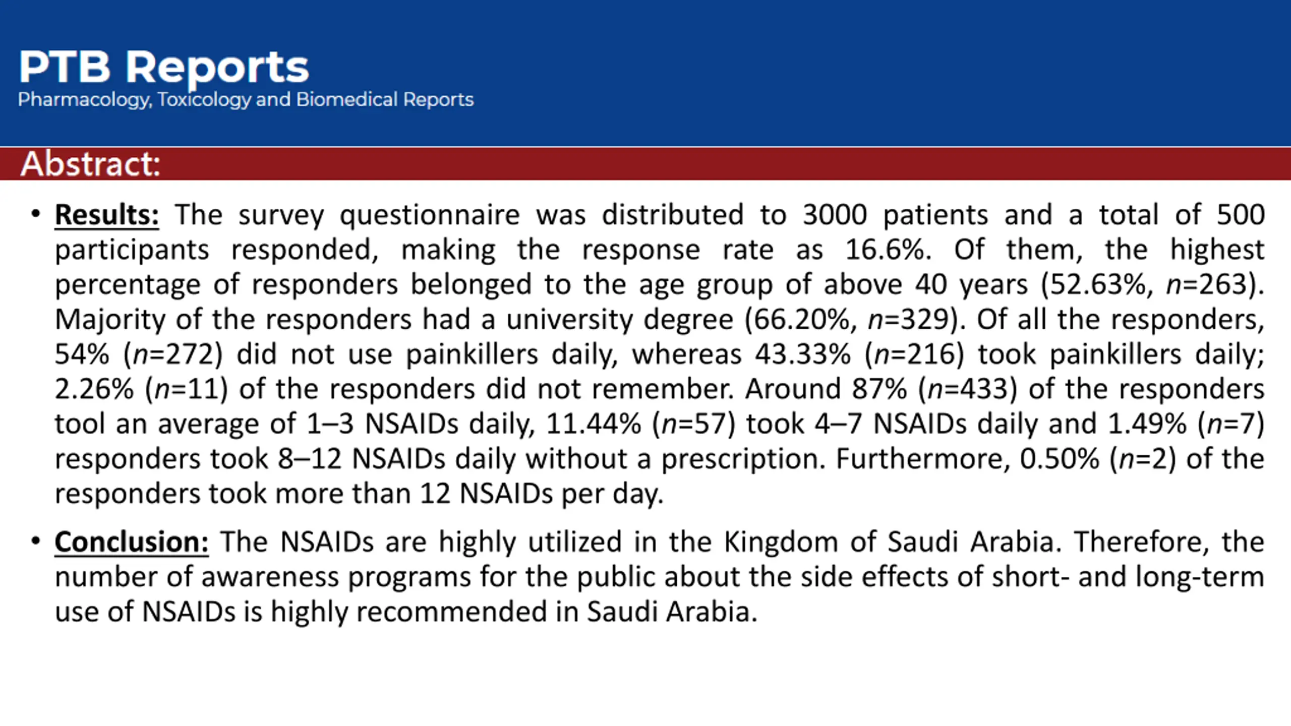Results: The survey questionnaire was distributed to 3000 patients and a total of 500 participants responded, making the response rate as 16.6%. Of them, the highest percentage of responders belonged to the age group of above 40 years (52.63%, n=263). Majority of the responders had a university degree (66.20%, n=329). Of all the responders, 54% (n=272) did not use painkillers daily, whereas 43.33% (n=216) took painkillers daily; 2.26% (n=11) of the responders did not remember. Around 87% (n=433) of the responders tool an average of 1 3 NSAIDs daily, 11.44% (n=57) took 4 7 NSAIDs daily and 1.49% (n=7) responders took 8 12 NSAIDs daily without a prescription. Furthermore, 0.50% (n=2) of the responders took more than 12 NSAIDs per day. Conclusion: The NSAIDs are highly utilized in the Kingdom of Saudi Arabia. Therefore, the number of awareness programs for the public about the side effects of short- and long-term use of NSAIDs is highly recommended in Saudi Arabia.