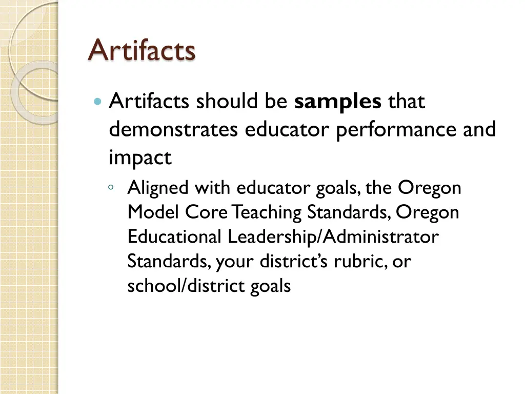 Artifacts Artifacts should be samples that demonstrates educator performance and impact Aligned with educator goals, the Oregon Model Core Teaching Standards, Oregon Educational Leadership/Administrator Standards, your district s rubric, or school/district goals