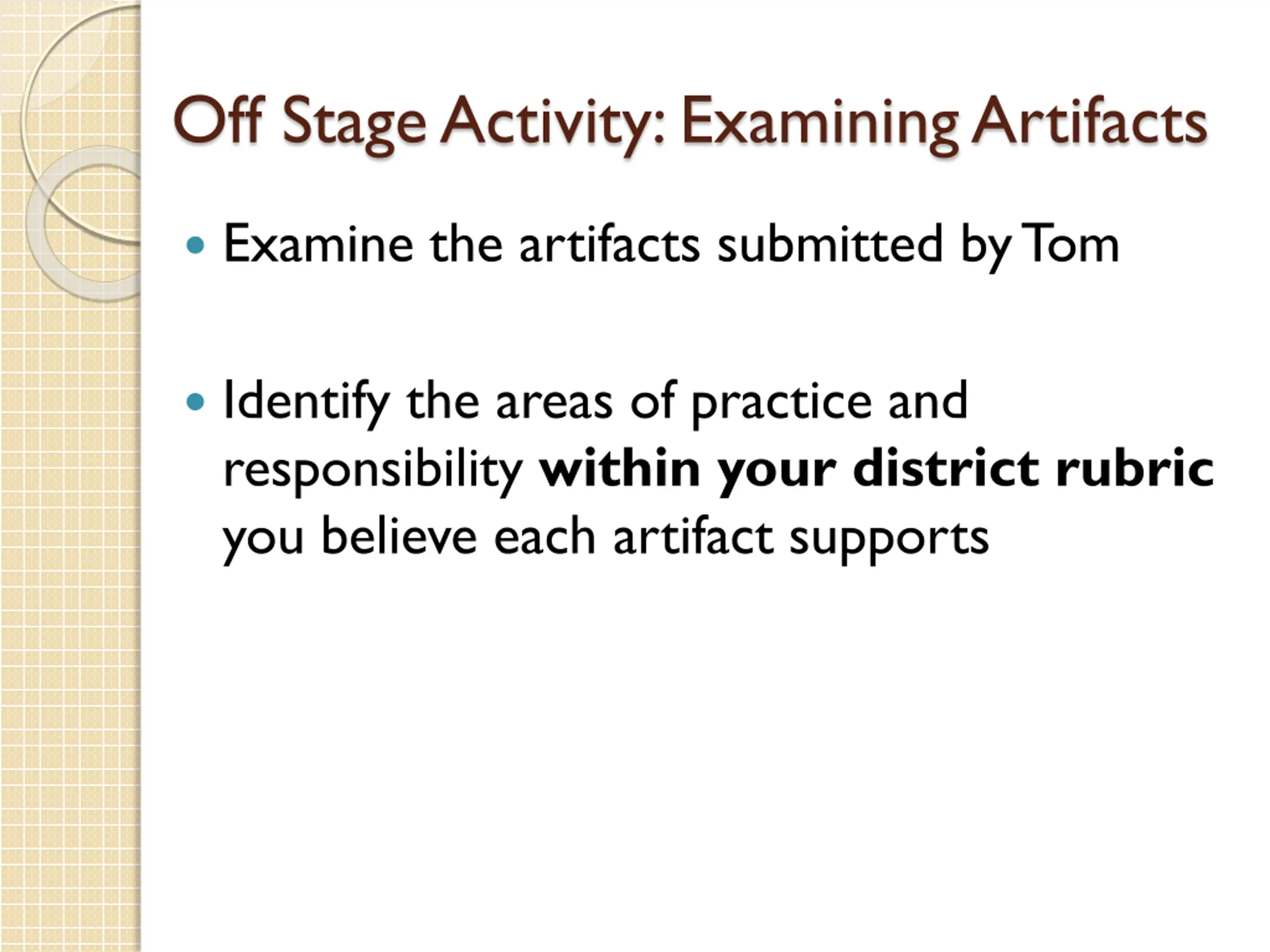 Off Stage Activity: Examining Artifacts Examine the artifacts submitted by Tom Identify the areas of practice and responsibility within your district rubric you believe each artifact supports