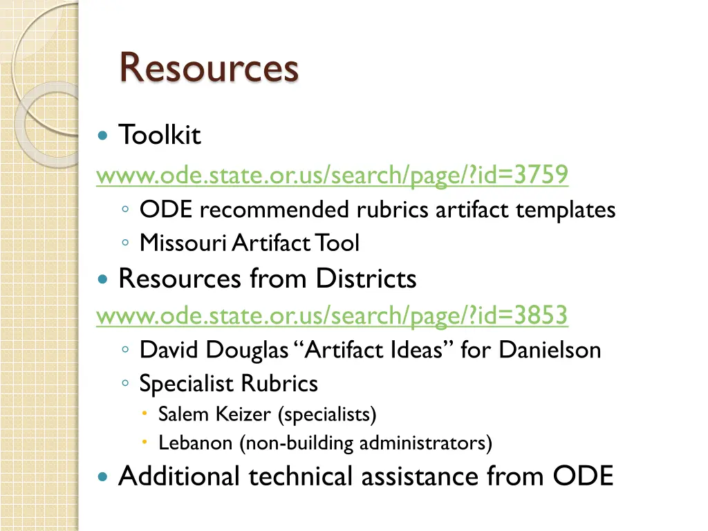 Resources Toolkit www.ode.state.or.us/search/page/?id=3759 ODE recommended rubrics artifact templates Missouri Artifact Tool Resources from Districts www.ode.state.or.us/search/page/?id=3853 David Douglas Artifact Ideas for Danielson Specialist Rubrics Salem Keizer (specialists) Lebanon (non-building administrators) Additional technical assistance from ODE