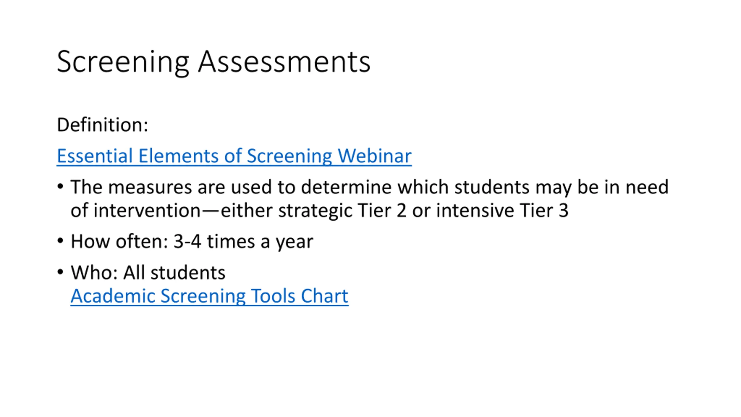 Screening Assessments Definition: Essential Elements of Screening Webinar The measures are used to determine which students may be in need of intervention either strategic Tier 2 or intensive Tier 3 How often: 3-4 times a year Who: All students Academic Screening Tools Chart