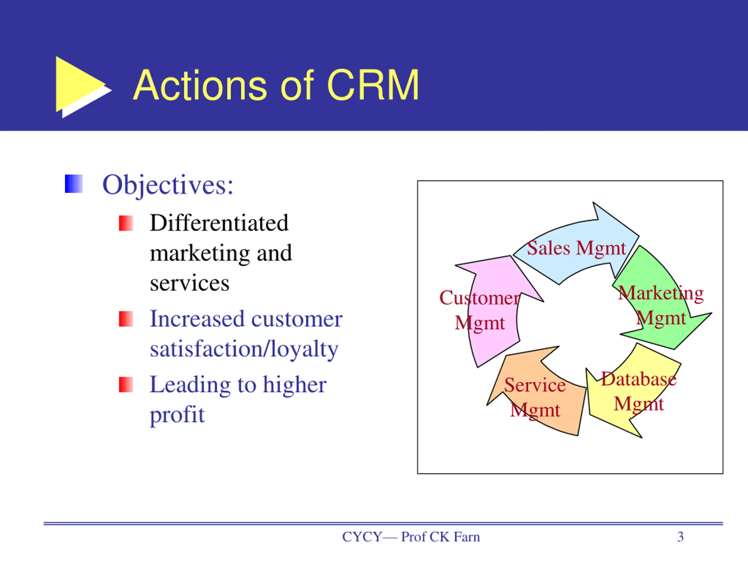Actions of CRM Objectives: Differentiated marketing and services Increased customer satisfaction/loyalty Leading to higher profit Sales Mgmt Marketing Mgmt Customer Mgmt Database Mgmt Service Mgmt CYCY Prof CK Farn 3