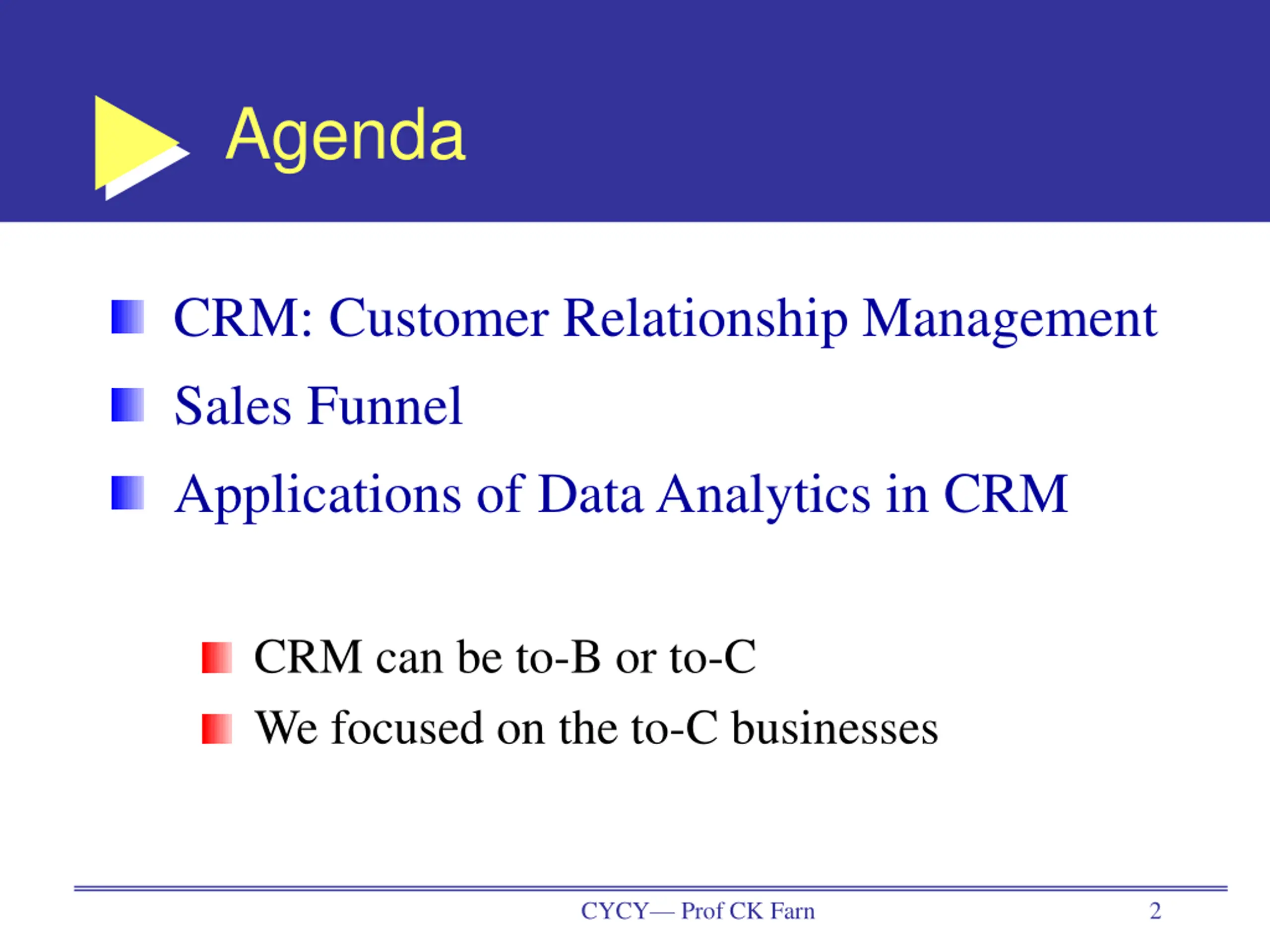Agenda CRM: Customer Relationship Management Sales Funnel Applications of Data Analytics in CRM CRM can be to-B or to-C We focused on the to-C businesses CYCY Prof CK Farn 2