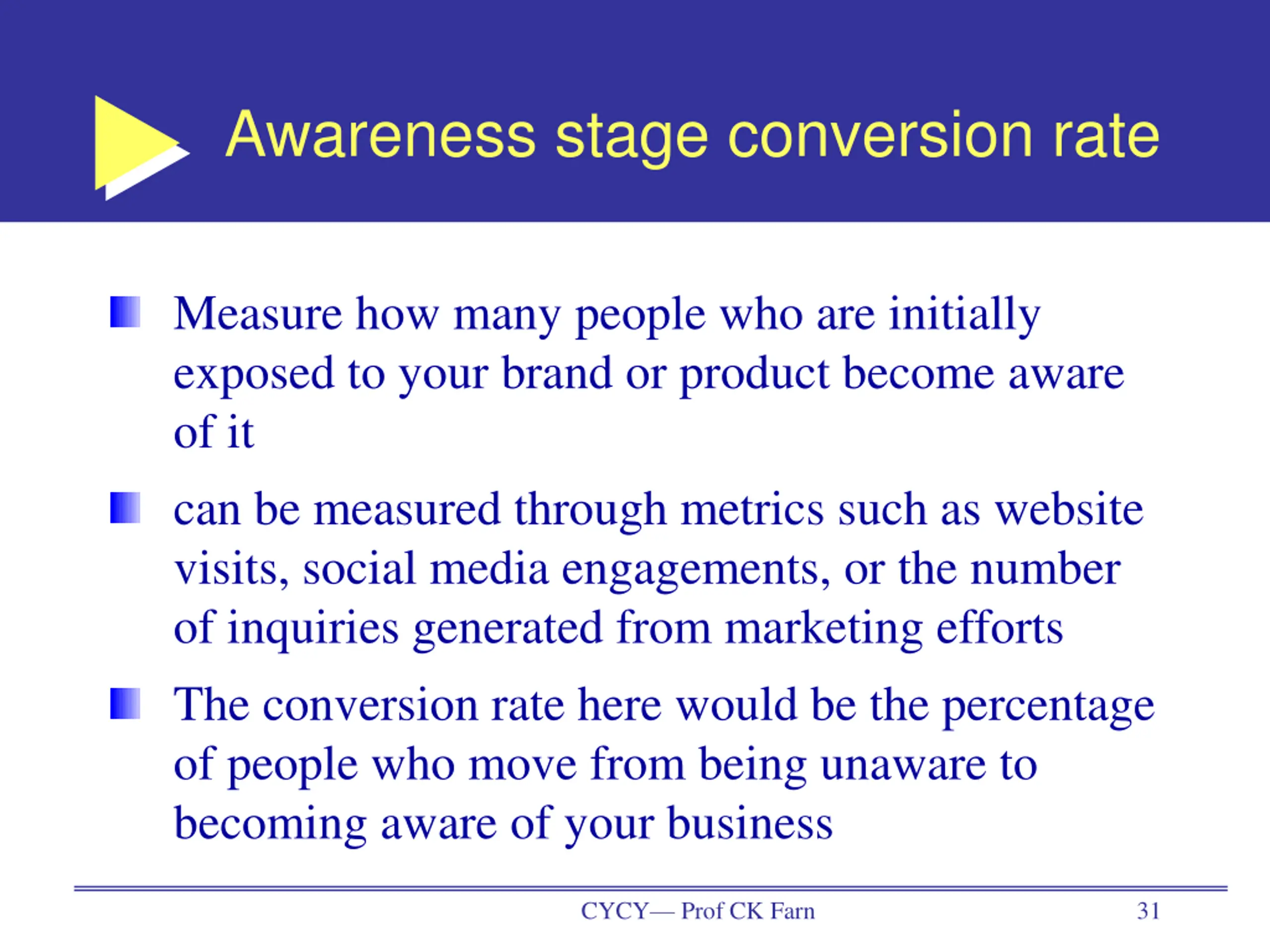 Awareness stage conversion rate Measure how many people who are initially exposed to your brand or product become aware of it can be measured through metrics such as website visits, social media engagements, or the number of inquiries generated from marketing efforts The conversion rate here would be the percentage of people who move from being unaware to becoming aware of your business CYCY Prof CK Farn 31