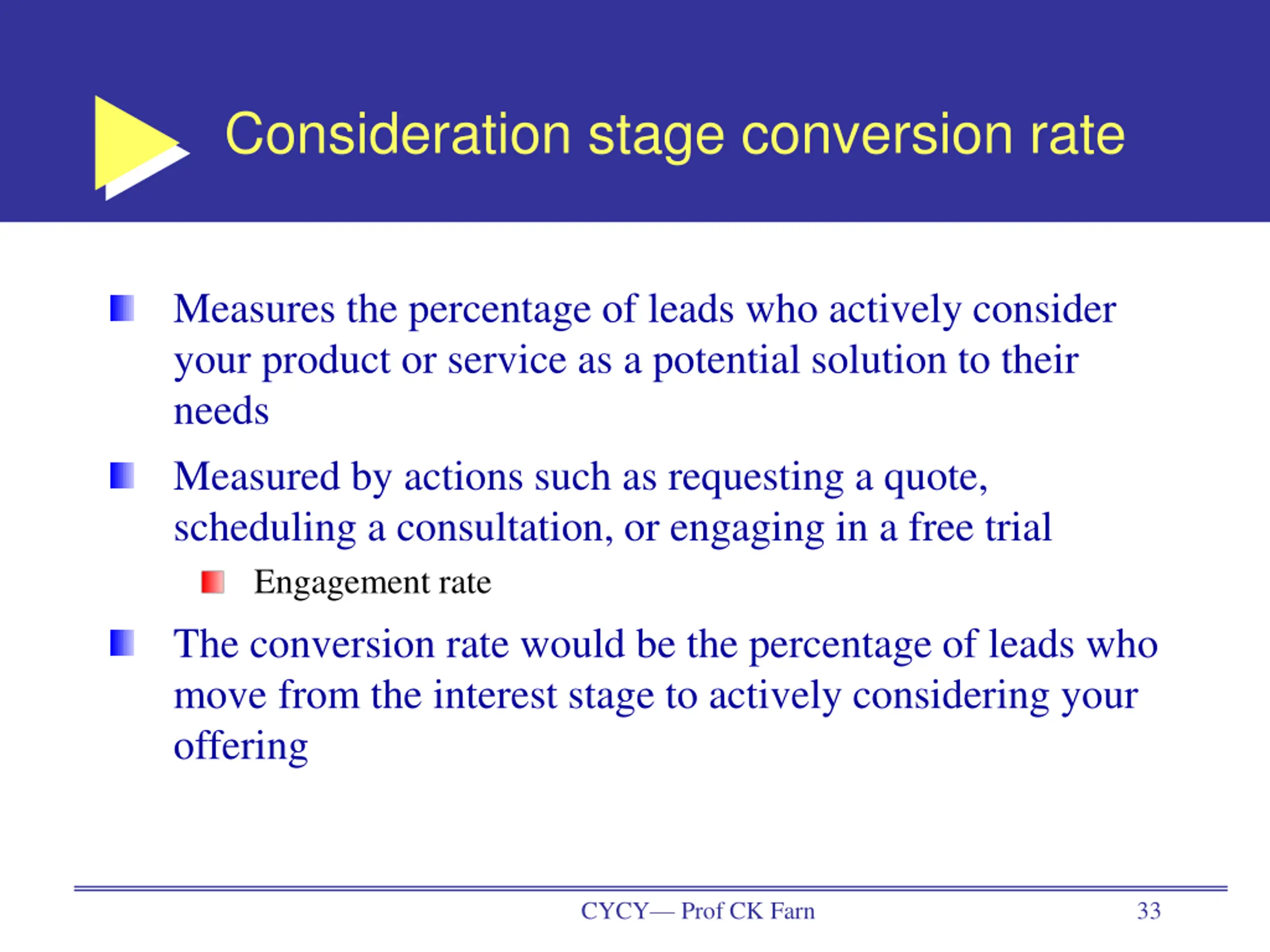 Consideration stage conversion rate Measures the percentage of leads who actively consider your product or service as a potential solution to their needs Measured by actions such as requesting a quote, scheduling a consultation, or engaging in a free trial Engagement rate The conversion rate would be the percentage of leads who move from the interest stage to actively considering your offering CYCY Prof CK Farn 33