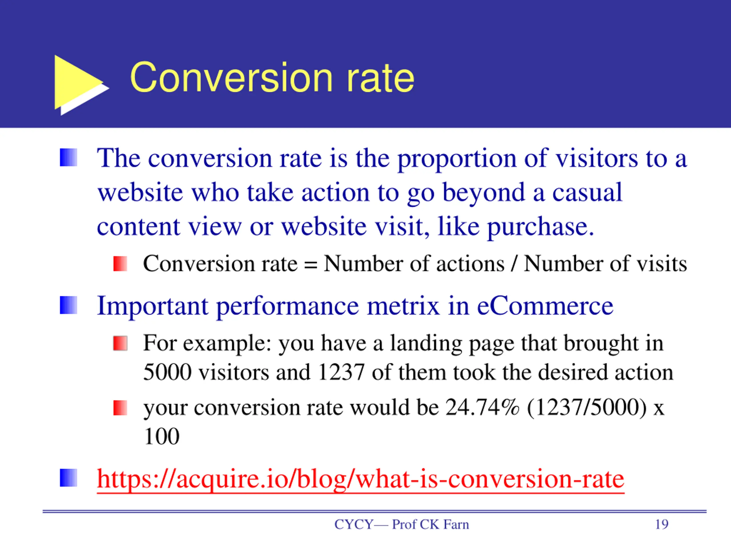Conversion rate The conversion rate is the proportion of visitors to a website who take action to go beyond a casual content view or website visit, like purchase. Conversion rate = Number of actions / Number of visits Important performance metrix in eCommerce For example: you have a landing page that brought in 5000 visitors and 1237 of them took the desired action your conversion rate would be 24.74% (1237/5000) x 100 https://acquire.io/blog/what-is-conversion-rate CYCY Prof CK Farn 19