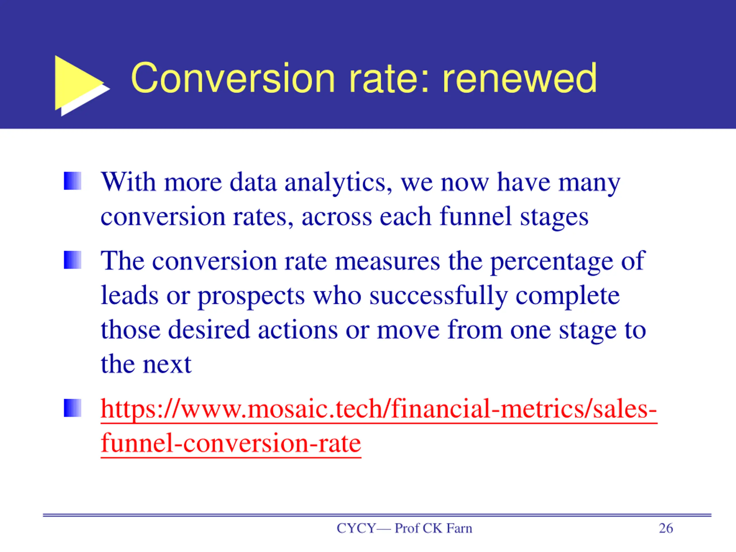 Conversion rate: renewed With more data analytics, we now have many conversion rates, across each funnel stages The conversion rate measures the percentage of leads or prospects who successfully complete those desired actions or move from one stage to the next https://www.mosaic.tech/financial-metrics/sales- funnel-conversion-rate CYCY Prof CK Farn 26