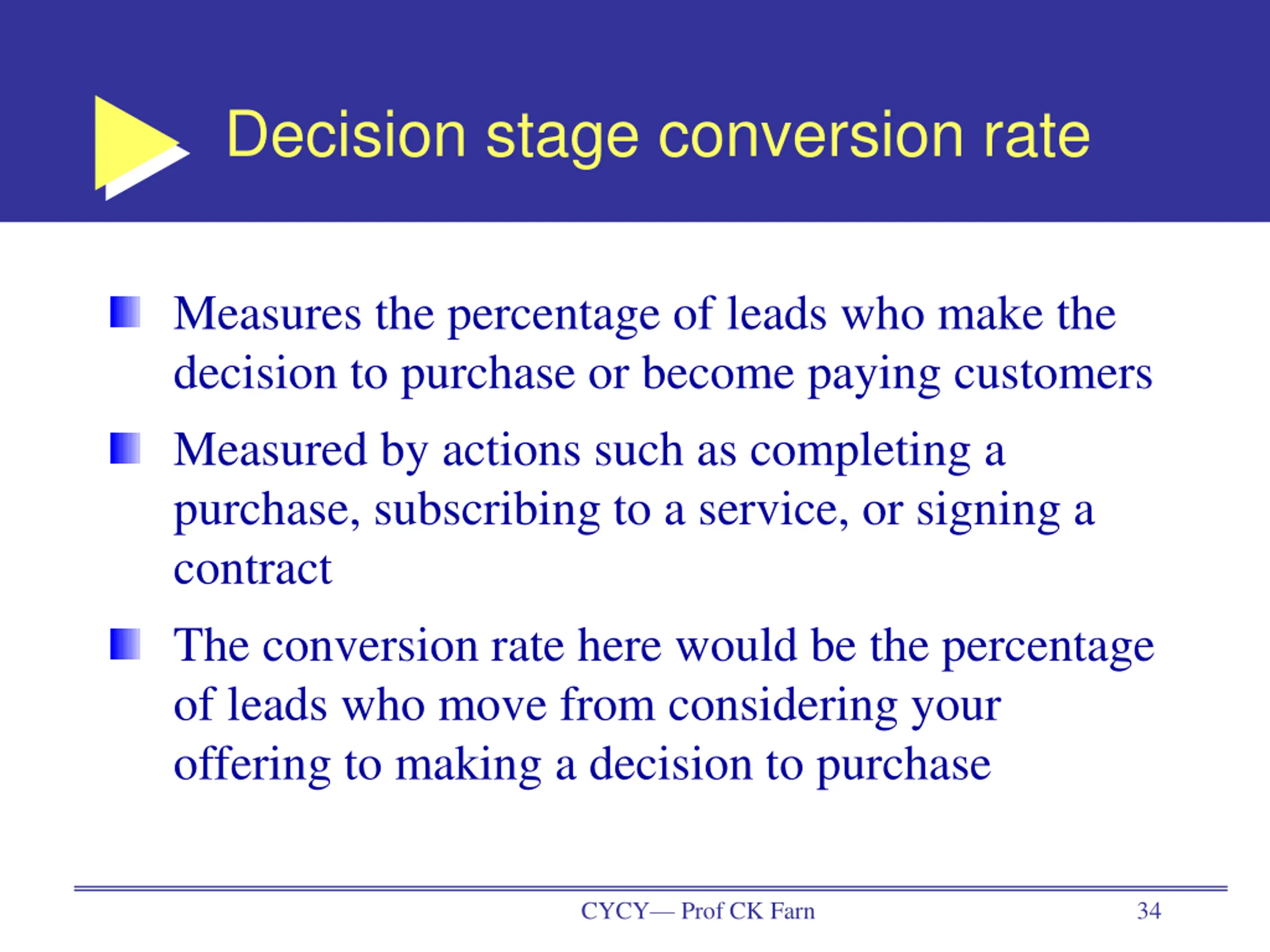 Decision stage conversion rate Measures the percentage of leads who make the decision to purchase or become paying customers Measured by actions such as completing a purchase, subscribing to a service, or signing a contract The conversion rate here would be the percentage of leads who move from considering your offering to making a decision to purchase CYCY Prof CK Farn 34