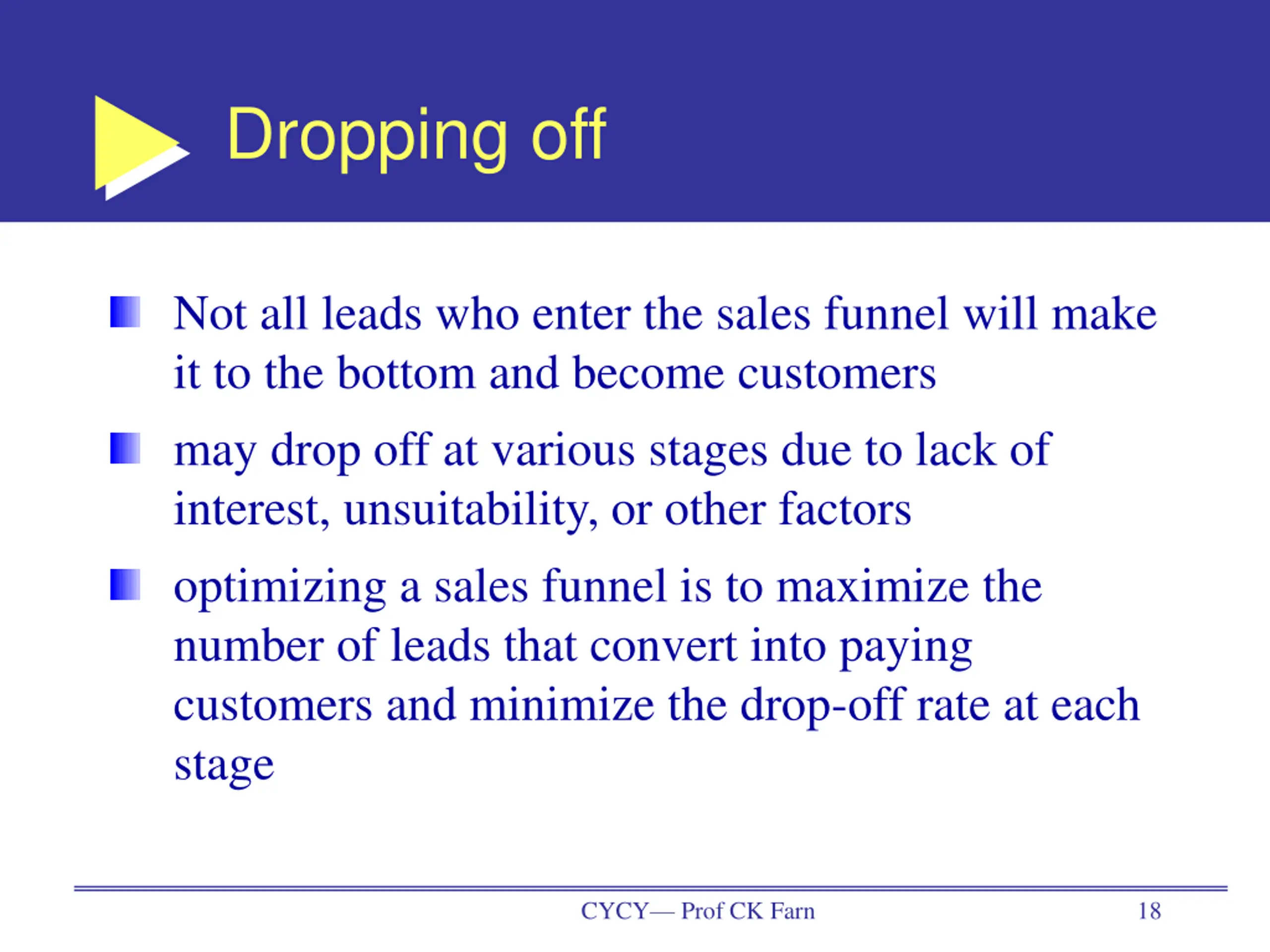 Dropping off Not all leads who enter the sales funnel will make it to the bottom and become customers may drop off at various stages due to lack of interest, unsuitability, or other factors optimizing a sales funnel is to maximize the number of leads that convert into paying customers and minimize the drop-off rate at each stage CYCY Prof CK Farn 18