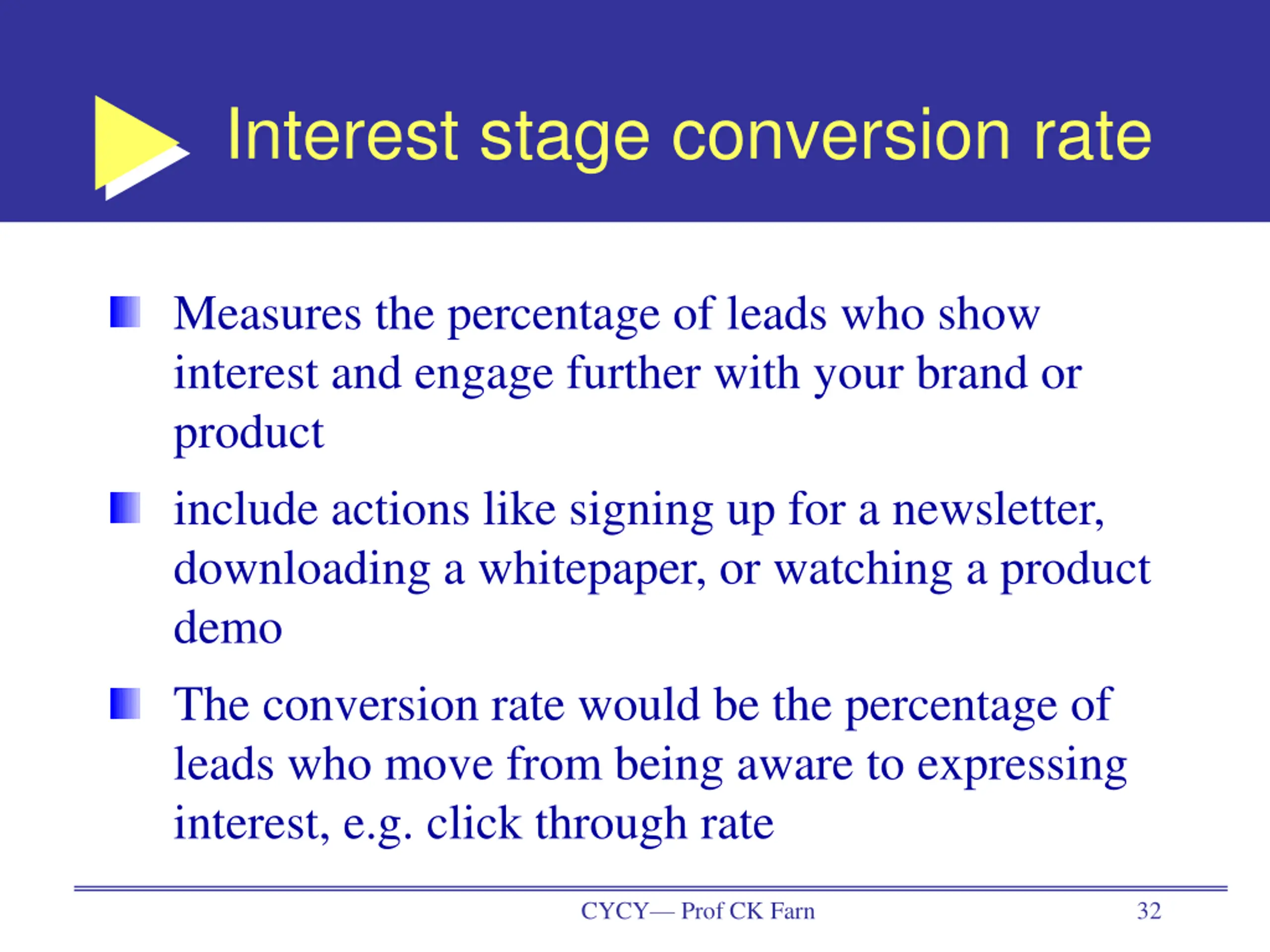 Interest stage conversion rate Measures the percentage of leads who show interest and engage further with your brand or product include actions like signing up for a newsletter, downloading a whitepaper, or watching a product demo The conversion rate would be the percentage of leads who move from being aware to expressing interest, e.g. click through rate CYCY Prof CK Farn 32
