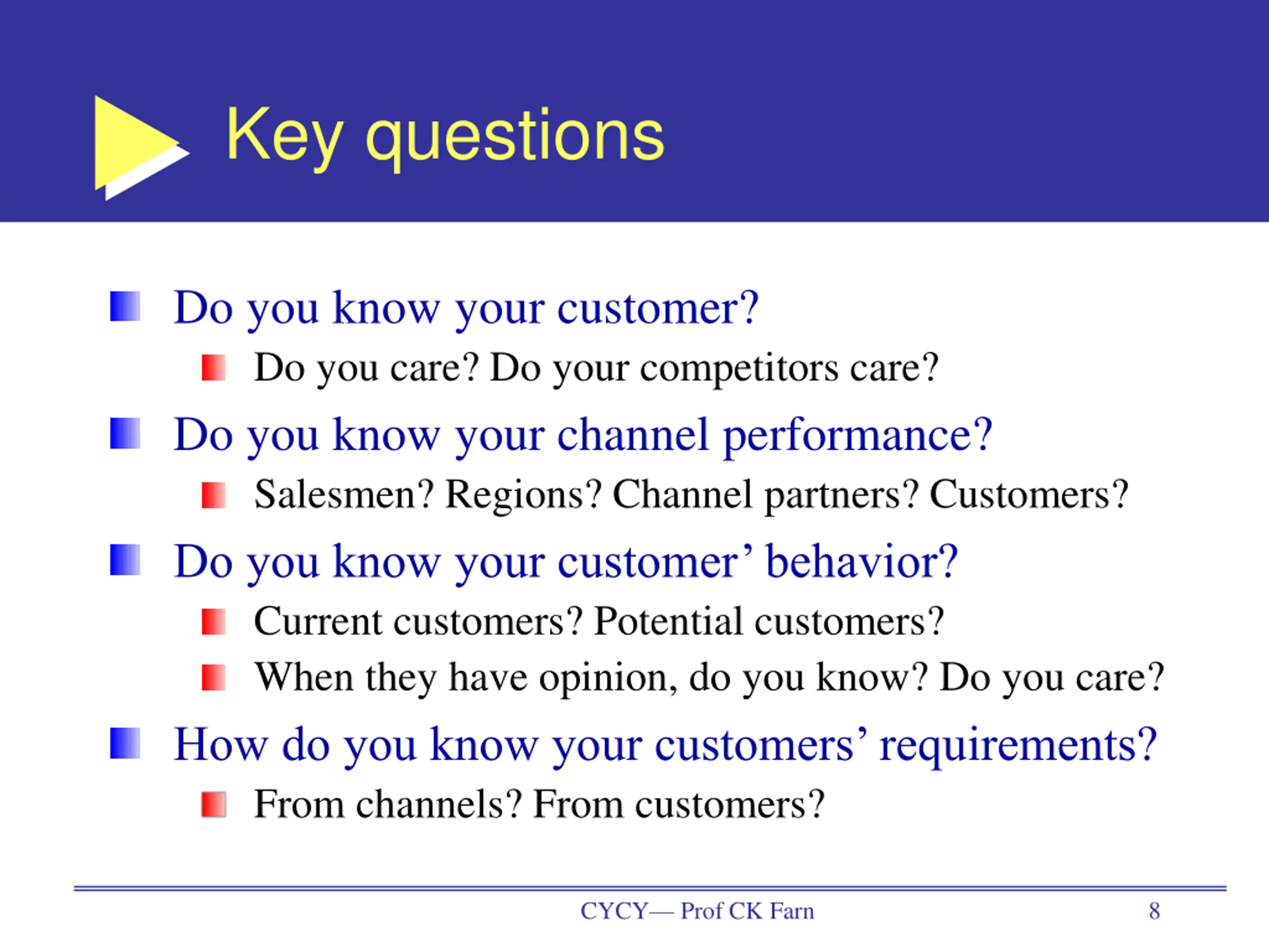 Key questions Do you know your customer? Do you care? Do your competitors care? Do you know your channel performance? Salesmen? Regions? Channel partners? Customers? Do you know your customer behavior? Current customers? Potential customers? When they have opinion, do you know? Do you care? How do you know your customers requirements? From channels? From customers? CYCY Prof CK Farn 8
