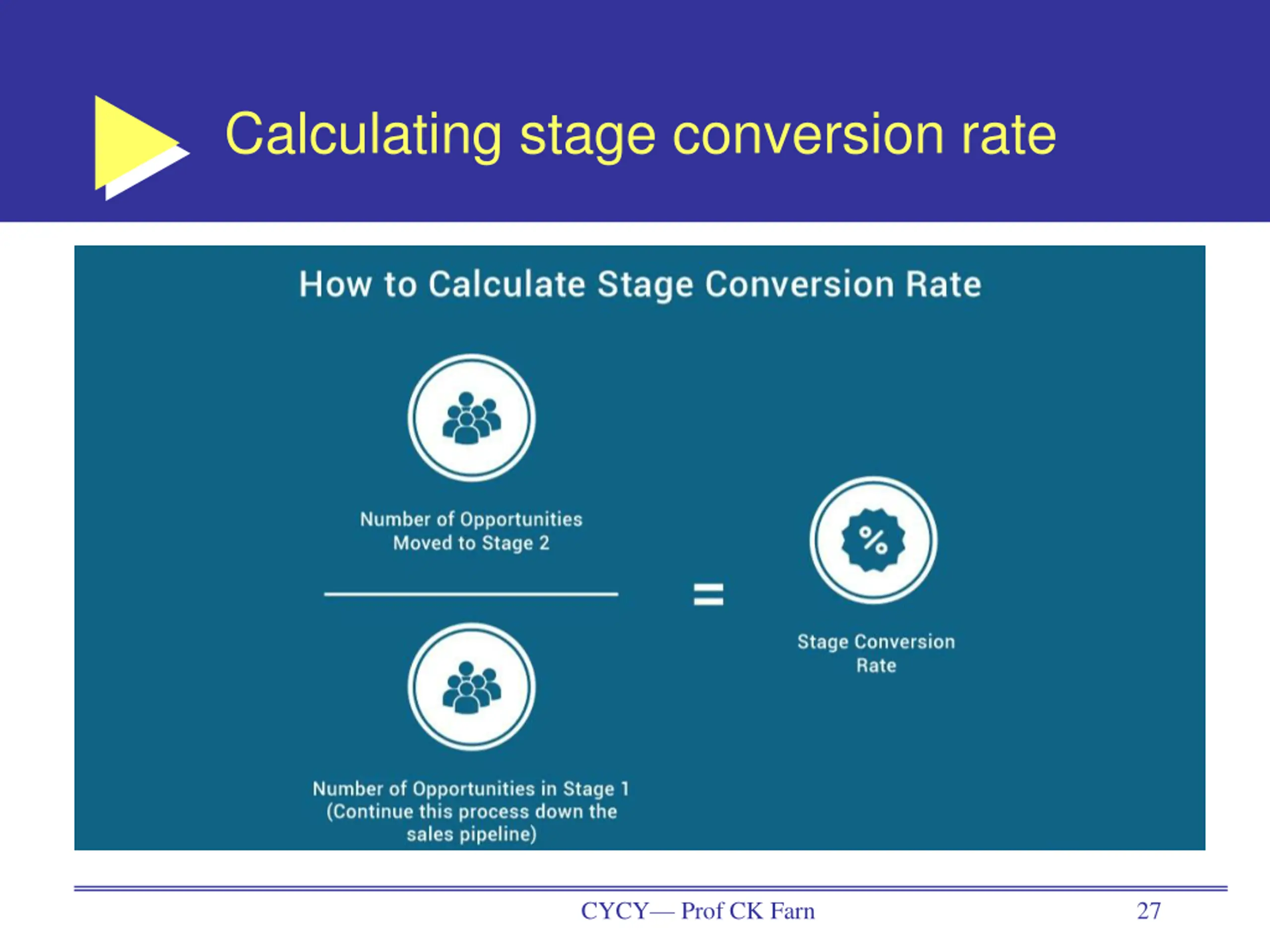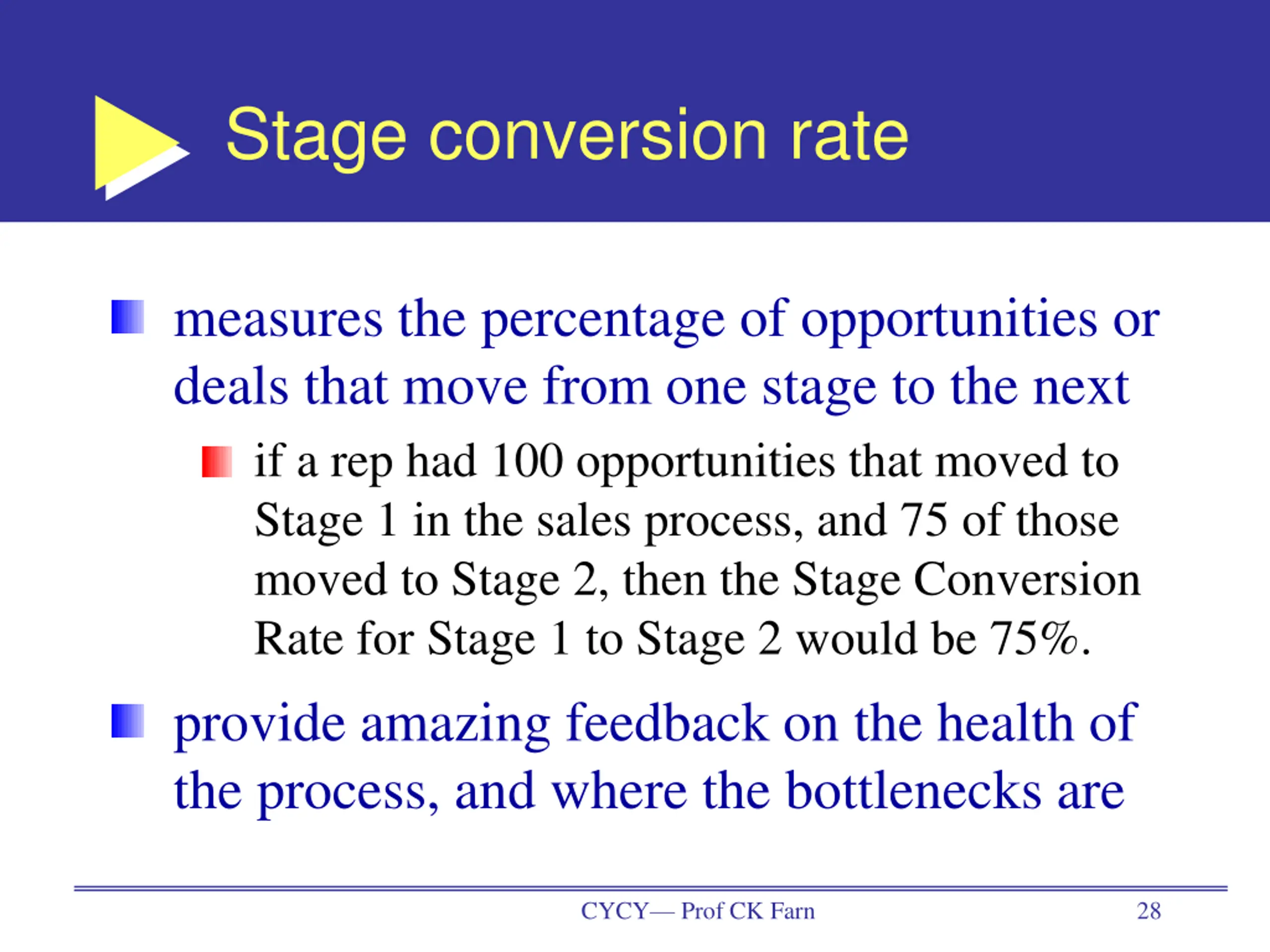 Stage conversion rate measures the percentage of opportunities or deals that move from one stage to the next if a rep had 100 opportunities that moved to Stage 1 in the sales process, and 75 of those moved to Stage 2, then the Stage Conversion Rate for Stage 1 to Stage 2 would be 75%. provide amazing feedback on the health of the process, and where the bottlenecks are CYCY Prof CK Farn 28