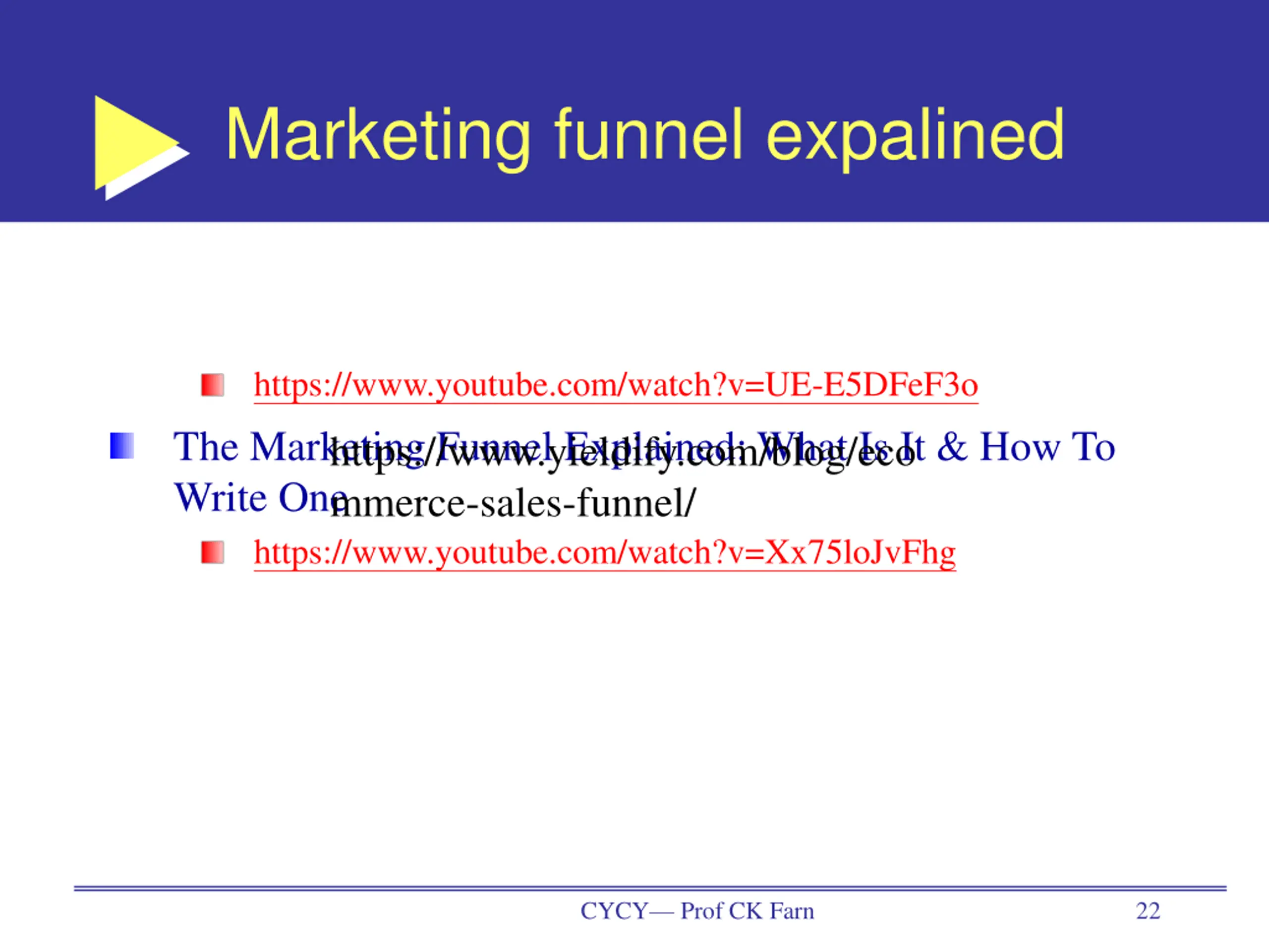 Marketing funnel expalined https://www.youtube.com/watch?v=UE-E5DFeF3o The Marketing Funnel Explained: What Is It & How To Write One https://www.youtube.com/watch?v=Xx75loJvFhg https://www.yieldify.com/blog/eco mmerce-sales-funnel/ CYCY Prof CK Farn 22
