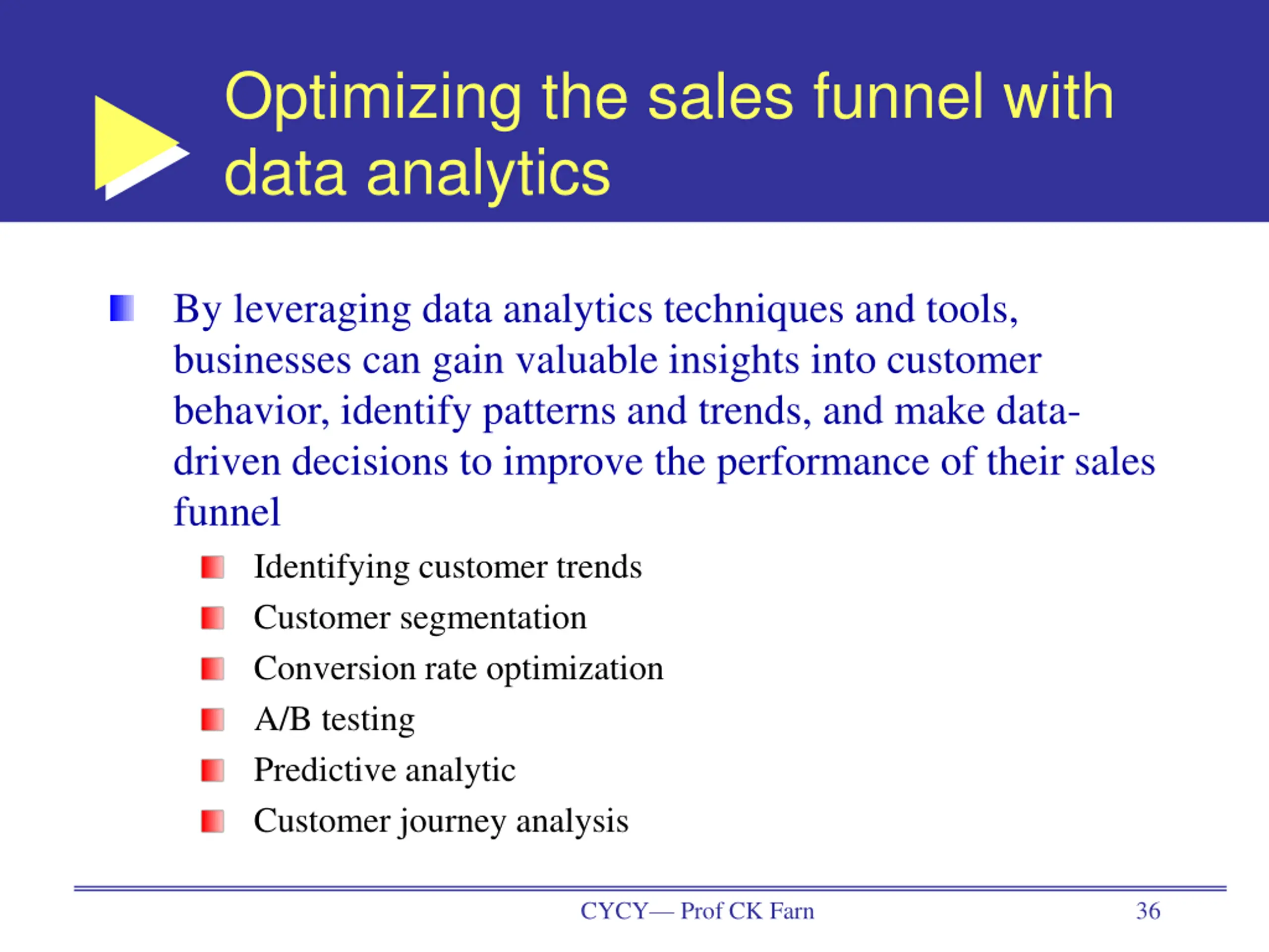 Optimizing the sales funnel with data analytics By leveraging data analytics techniques and tools, businesses can gain valuable insights into customer behavior, identify patterns and trends, and make data- driven decisions to improve the performance of their sales funnel Identifying customer trends Customer segmentation Conversion rate optimization A/B testing Predictive analytic Customer journey analysis CYCY Prof CK Farn 36