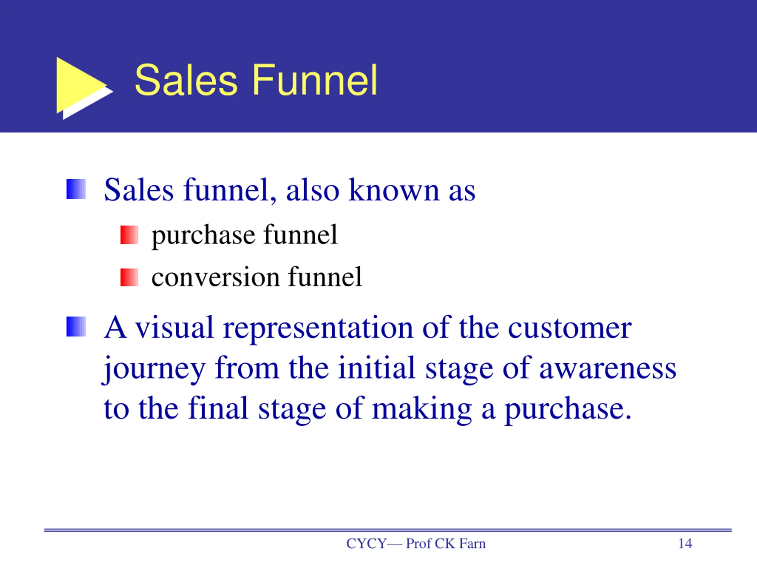 Sales Funnel Sales funnel, also known as purchase funnel conversion funnel A visual representation of the customer journey from the initial stage of awareness to the final stage of making a purchase. CYCY Prof CK Farn 14