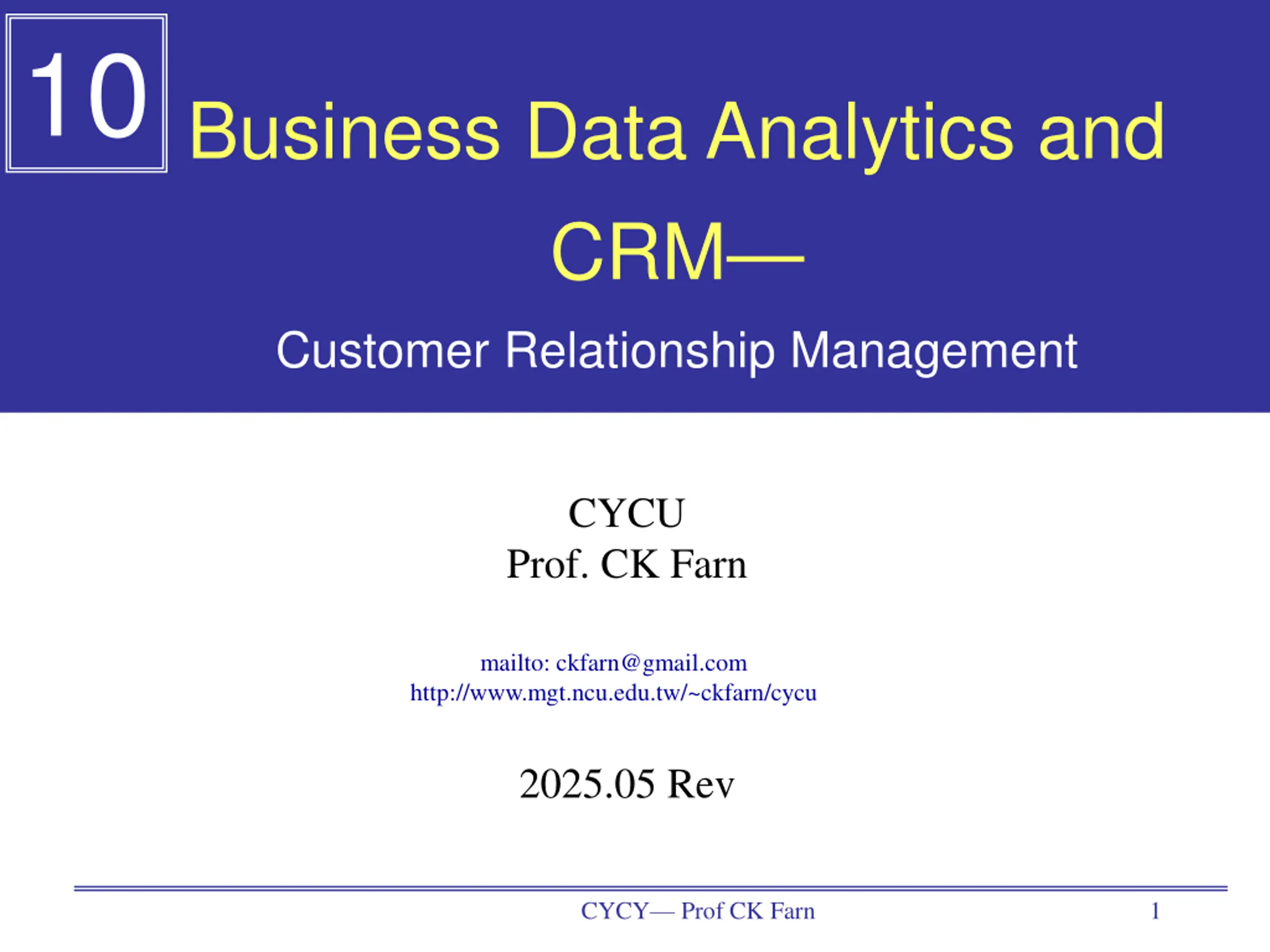 10 Business Data Analytics and CRM Customer Relationship Management CYCU Prof. CK Farn mailto: ckfarn@gmail.com http://www.mgt.ncu.edu.tw/~ckfarn/cycu 2025.05 Rev CYCY Prof CK Farn 1