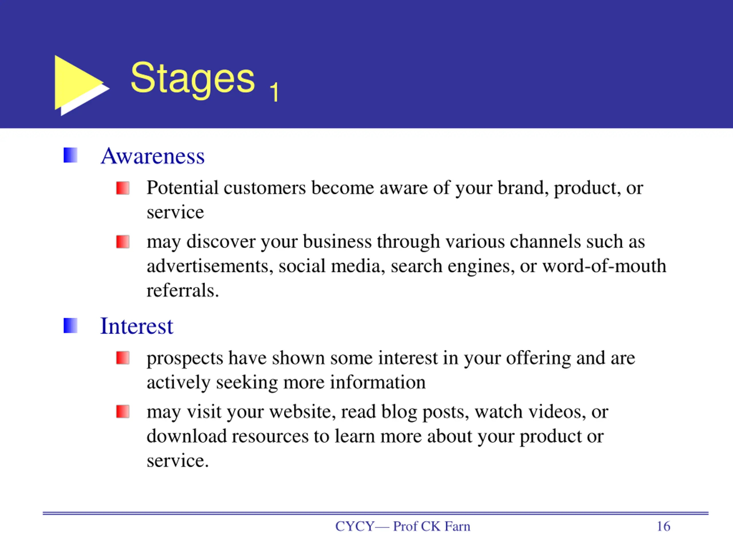Stages 1 Awareness Potential customers become aware of your brand, product, or service may discover your business through various channels such as advertisements, social media, search engines, or word-of-mouth referrals. Interest prospects have shown some interest in your offering and are actively seeking more information may visit your website, read blog posts, watch videos, or download resources to learn more about your product or service. CYCY Prof CK Farn 16