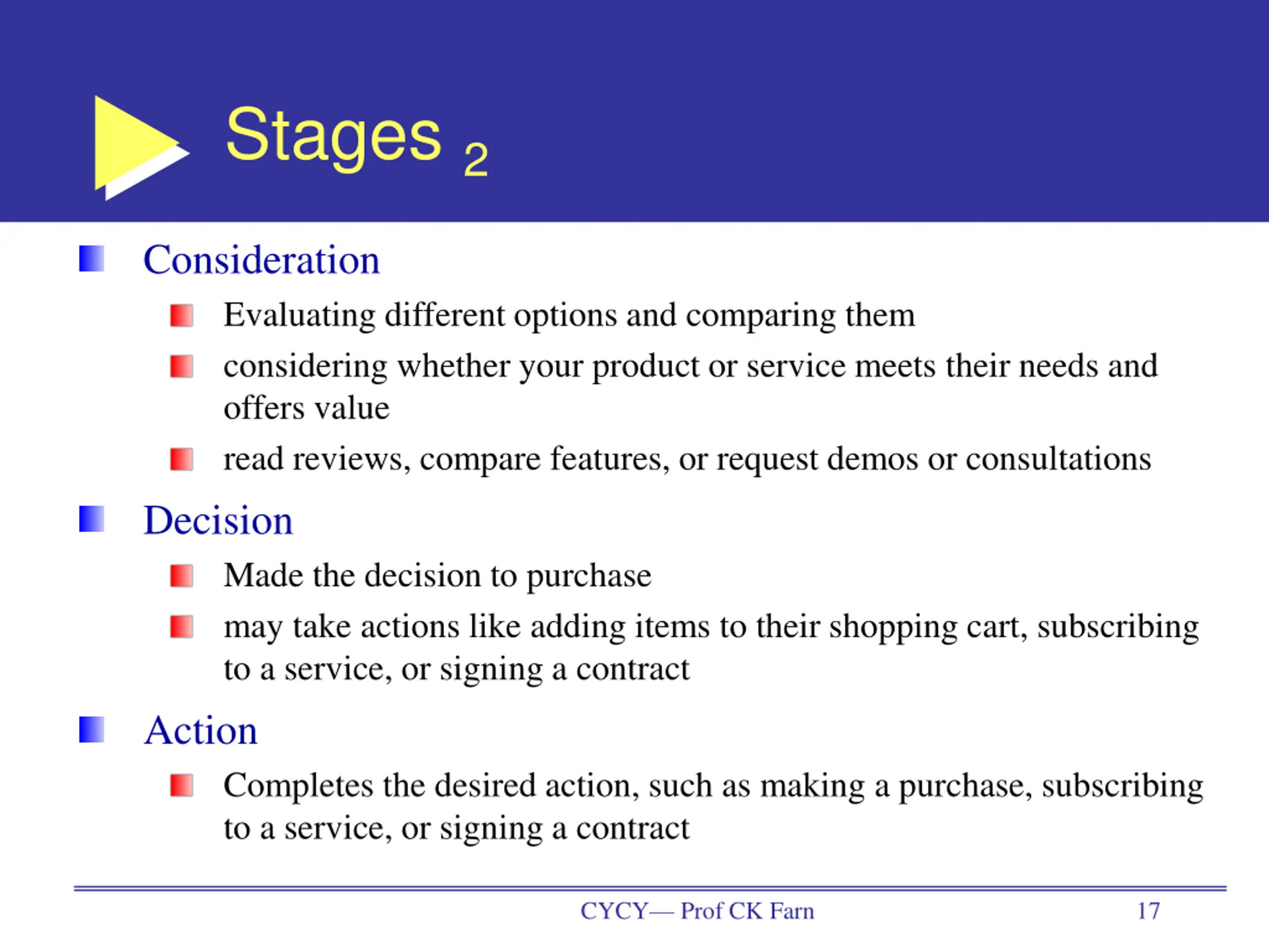 Stages 2 Consideration Evaluating different options and comparing them considering whether your product or service meets their needs and offers value read reviews, compare features, or request demos or consultations Decision Made the decision to purchase may take actions like adding items to their shopping cart, subscribing to a service, or signing a contract Action Completes the desired action, such as making a purchase, subscribing to a service, or signing a contract CYCY Prof CK Farn 17