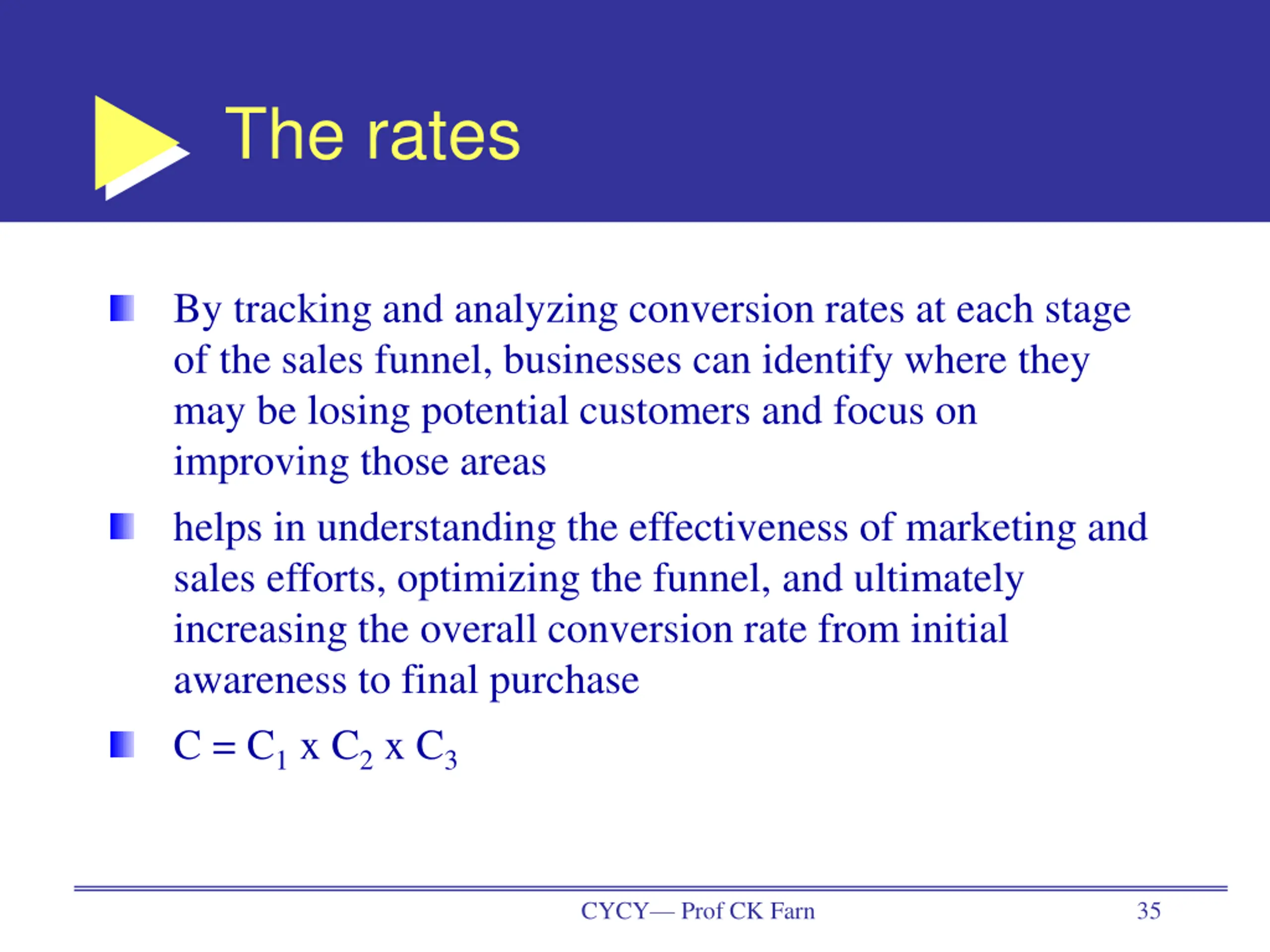 The rates By tracking and analyzing conversion rates at each stage of the sales funnel, businesses can identify where they may be losing potential customers and focus on improving those areas helps in understanding the effectiveness of marketing and sales efforts, optimizing the funnel, and ultimately increasing the overall conversion rate from initial awareness to final purchase C = C1x C2x C3 CYCY Prof CK Farn 35