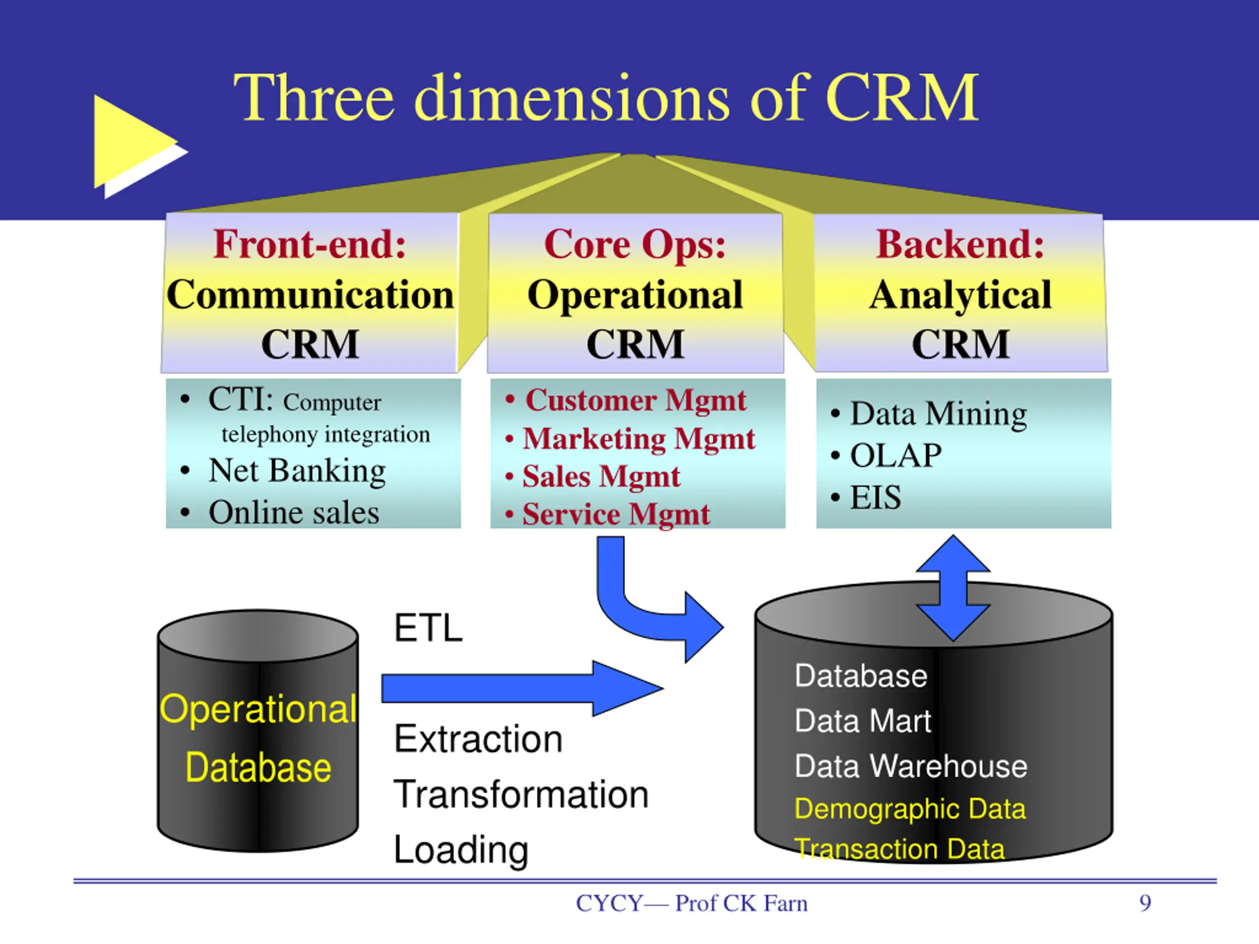 Three dimensions of CRM Front-end: Communication CRM CTI: Computer telephony integration Net Banking Online sales Core Ops: Operational CRM Customer Mgmt Marketing Mgmt Sales Mgmt Service Mgmt Backend: Analytical CRM Data Mining OLAP EIS ETL Database Data Mart Data Warehouse Demographic Data Transaction Data Operational Database Extraction Transformation Loading CYCY Prof CK Farn 9